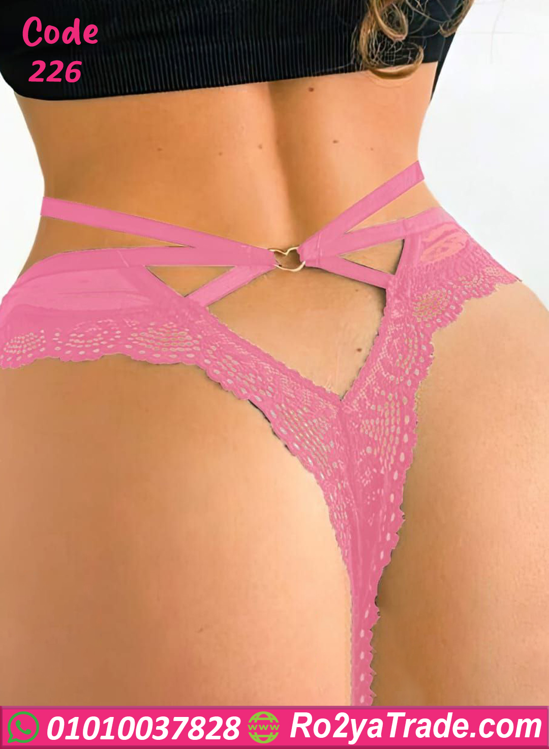 كلوت داخلي حريمي دانتيل بتصميم جريء وأنثوي، مفتوح من الخلف مع شرايط متقاطعة ولمسة معدنية في الوسط، خامة ناعمة وخفيفة على الجسم، مناسب للحظات الخاصة.