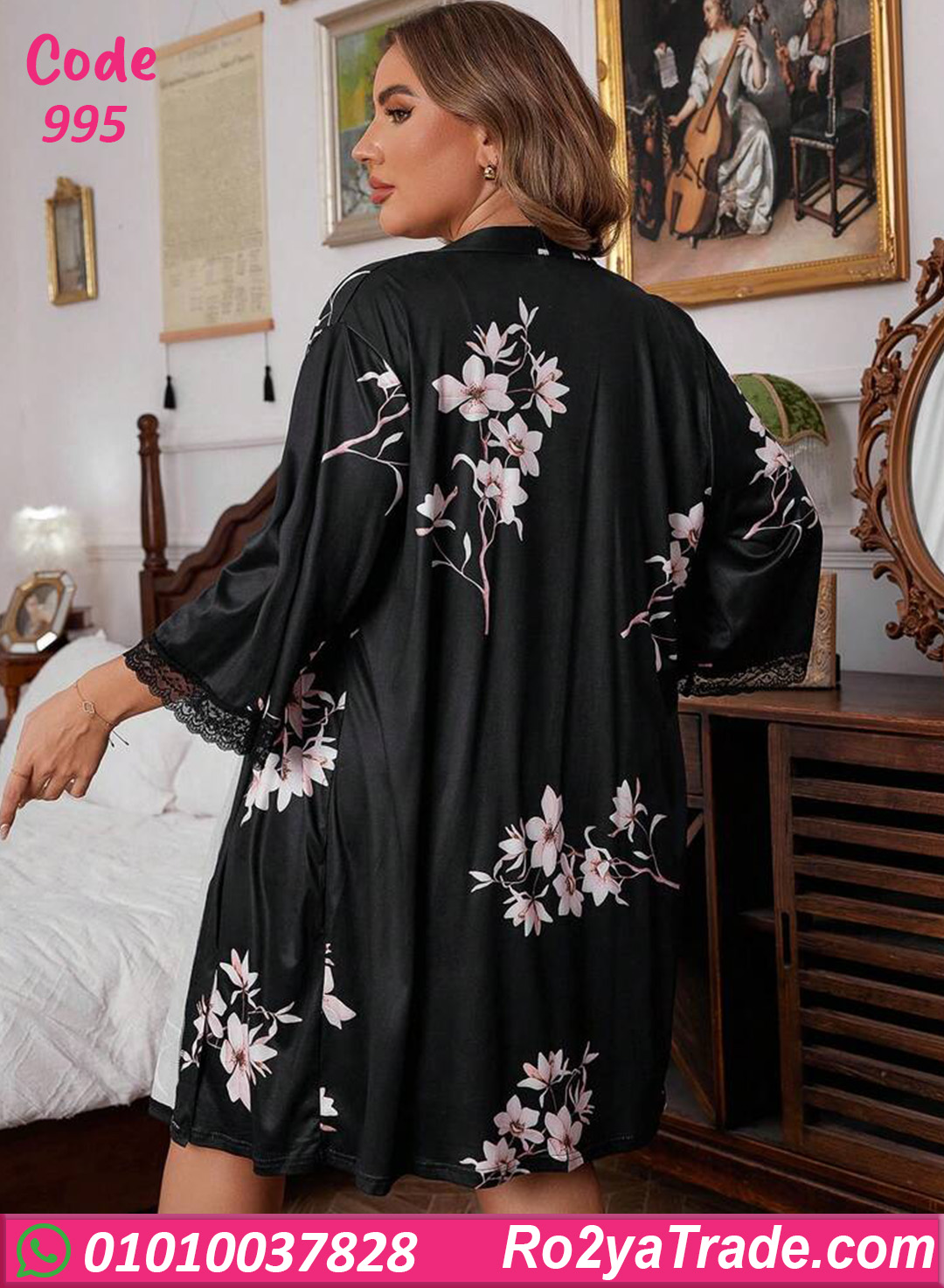 طقم لانجري شيك مكون من فستان قصير زبده مع روب دانتيل ورسمة ورد رقيقة، بيدي شكل أنثوي فخم وجذاب.