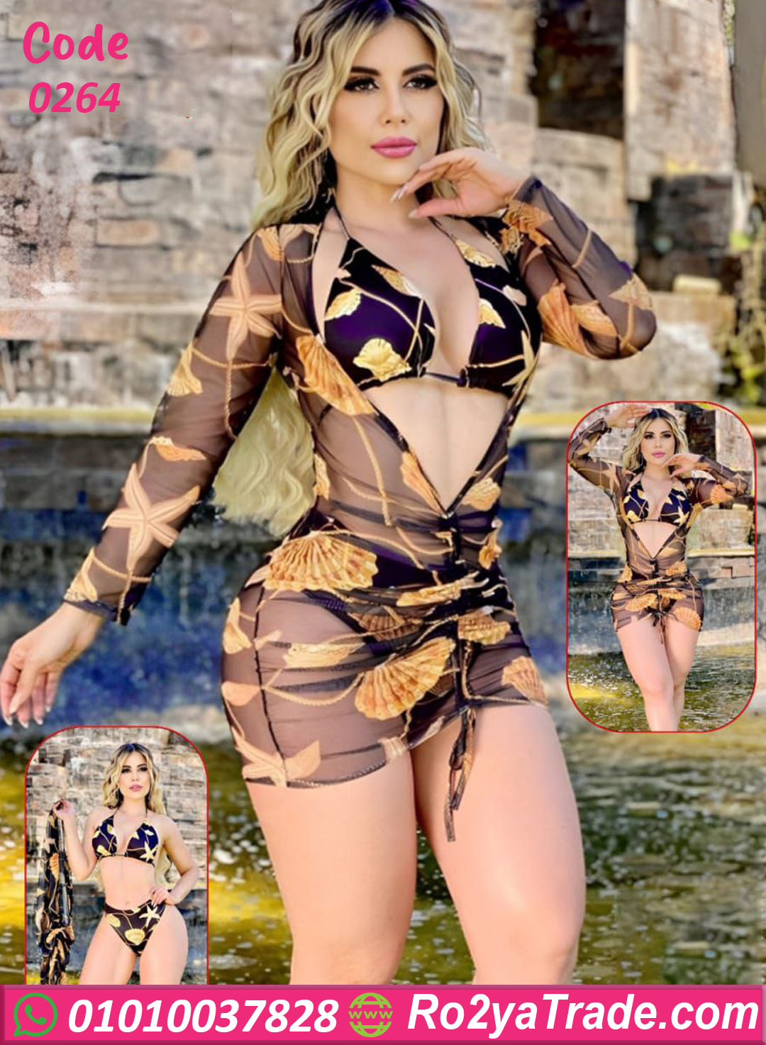 الطقم بيتكوّن من بكيني قصير بخامة ناعمة وجاكت شيفون طويل شفاف بيكمل الإطلالة بأنوثة وأناقة.