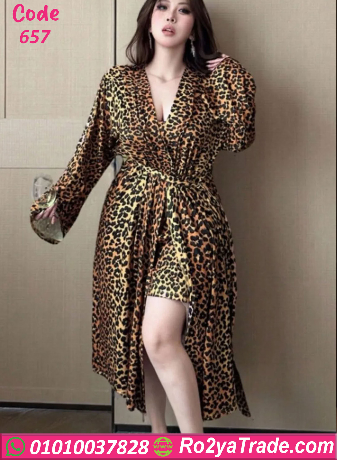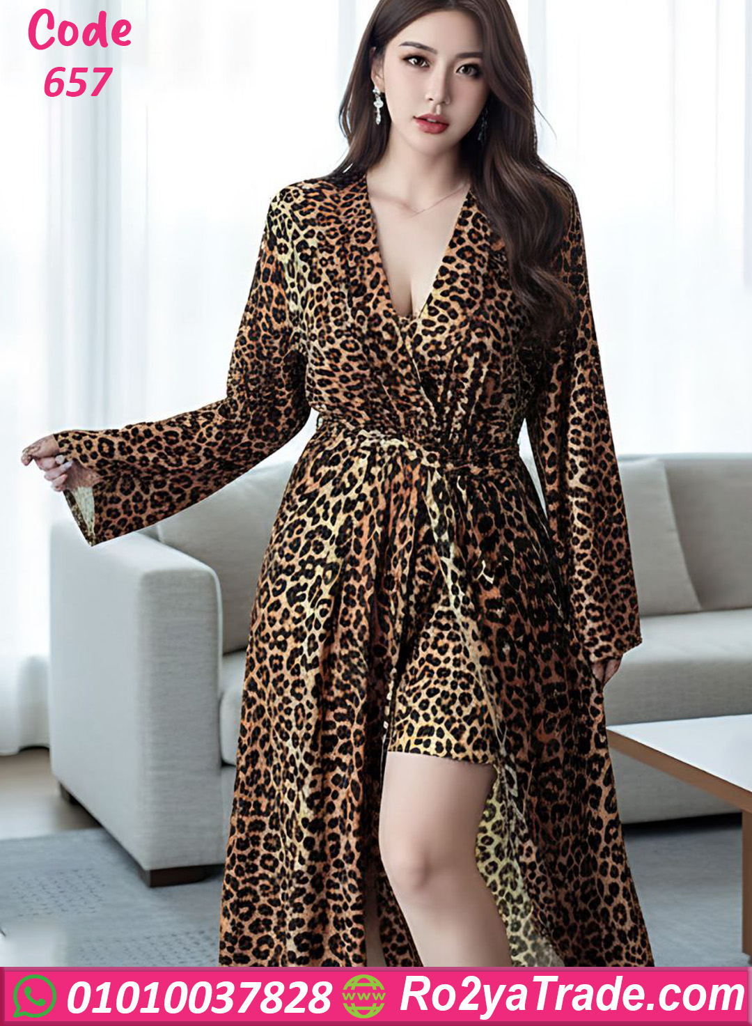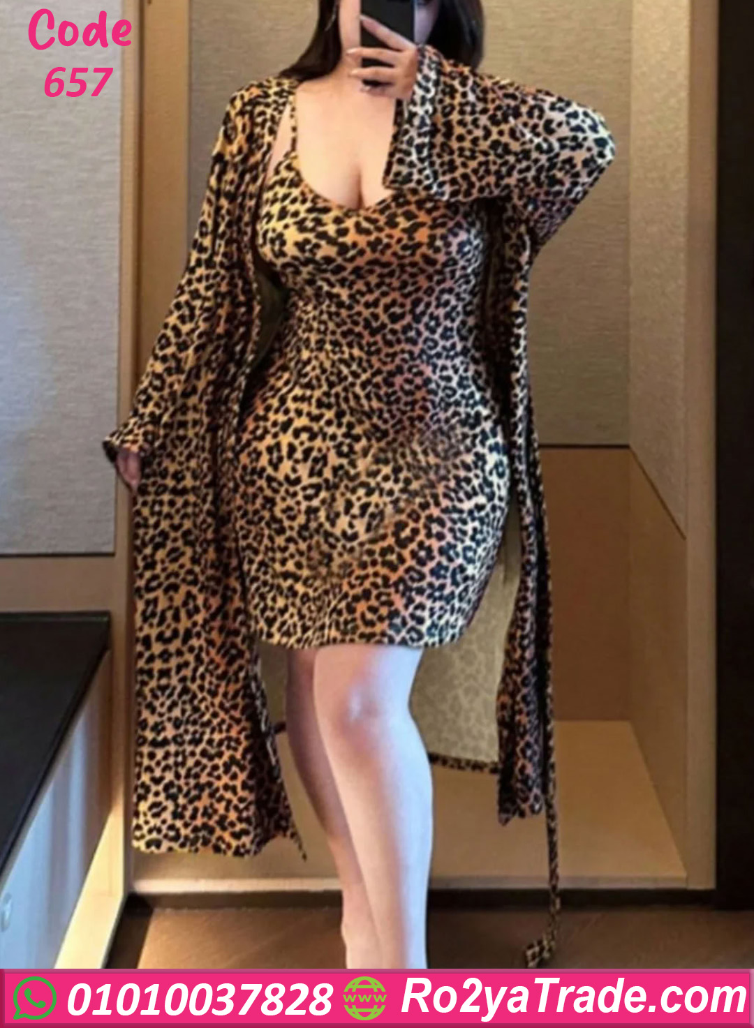 الطقم مكون من لانجري قصير مع روب طويل بنفس النقشة ليعطي إطلالة متكاملة وجذابة.