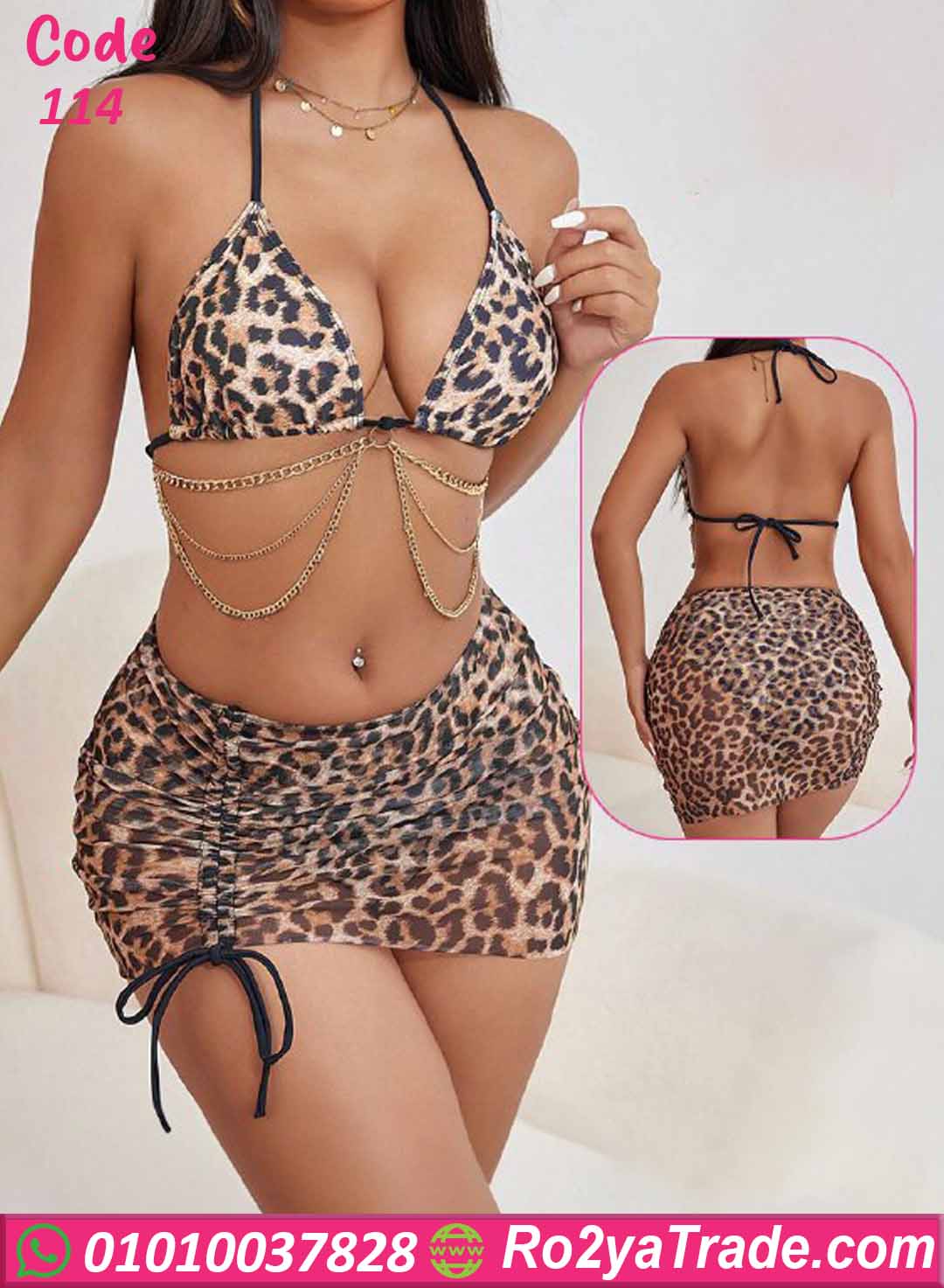 الطقم يتكون من توب بتصميم مثلث بنقشة التايجر الجذابة مع أربطة خلفية قابلة للتعديل لتناسب مختلف المقاسات، بالإضافة إلى سلاسل ذهبية أنيقة على الخصر تضيف لمسة فخامة وجاذبية للتصميم.