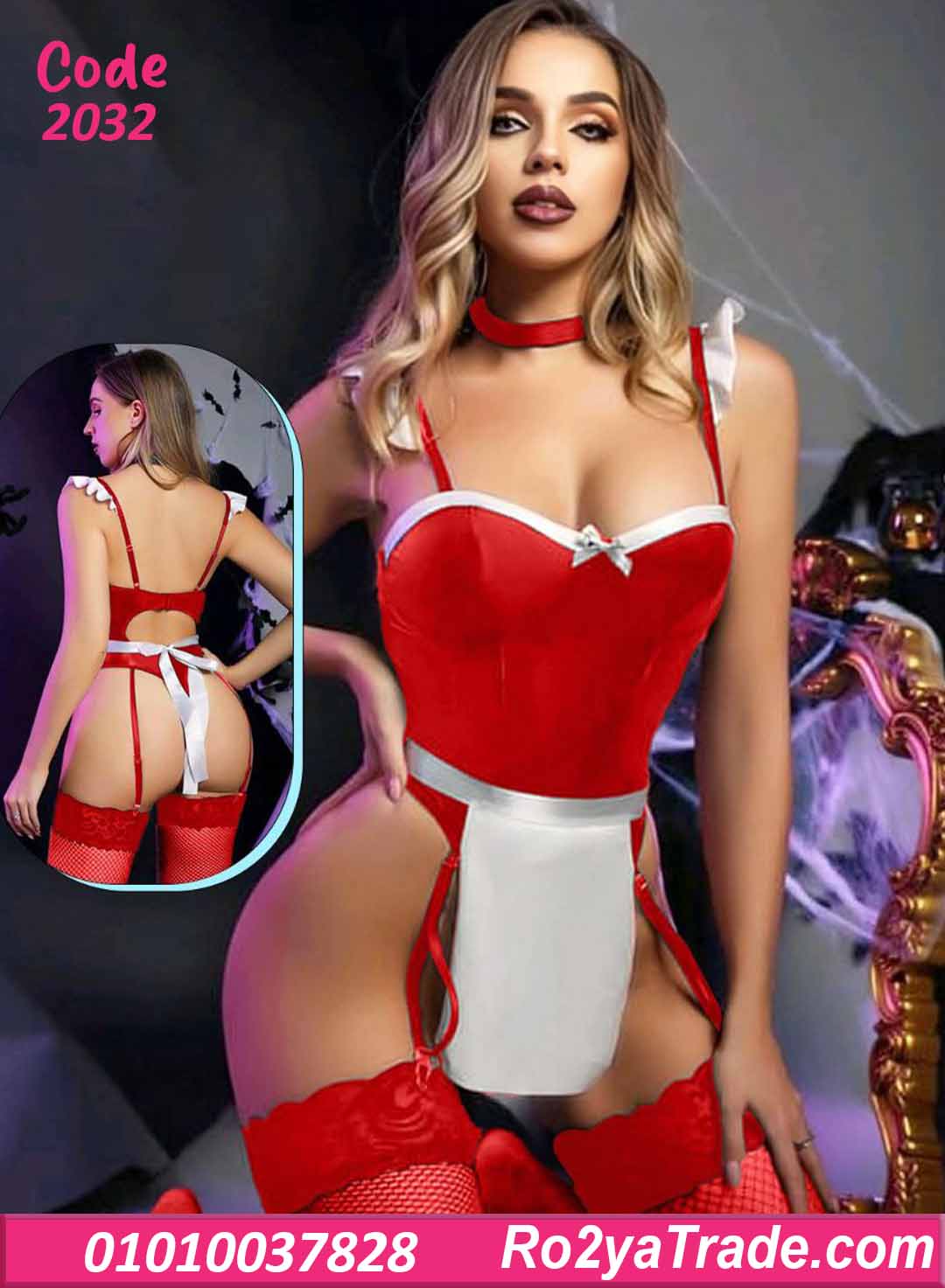 لانجري تنكري بتصميم خادمة جريء وجذاب، يجمع بين الستايل الكلاسيك الأبيض والأسود أو الأحمر والأبيض مع تفاصيل دانتيل وأنوثة واضحة تخلي إطلالتك مختلفة ومميزة.