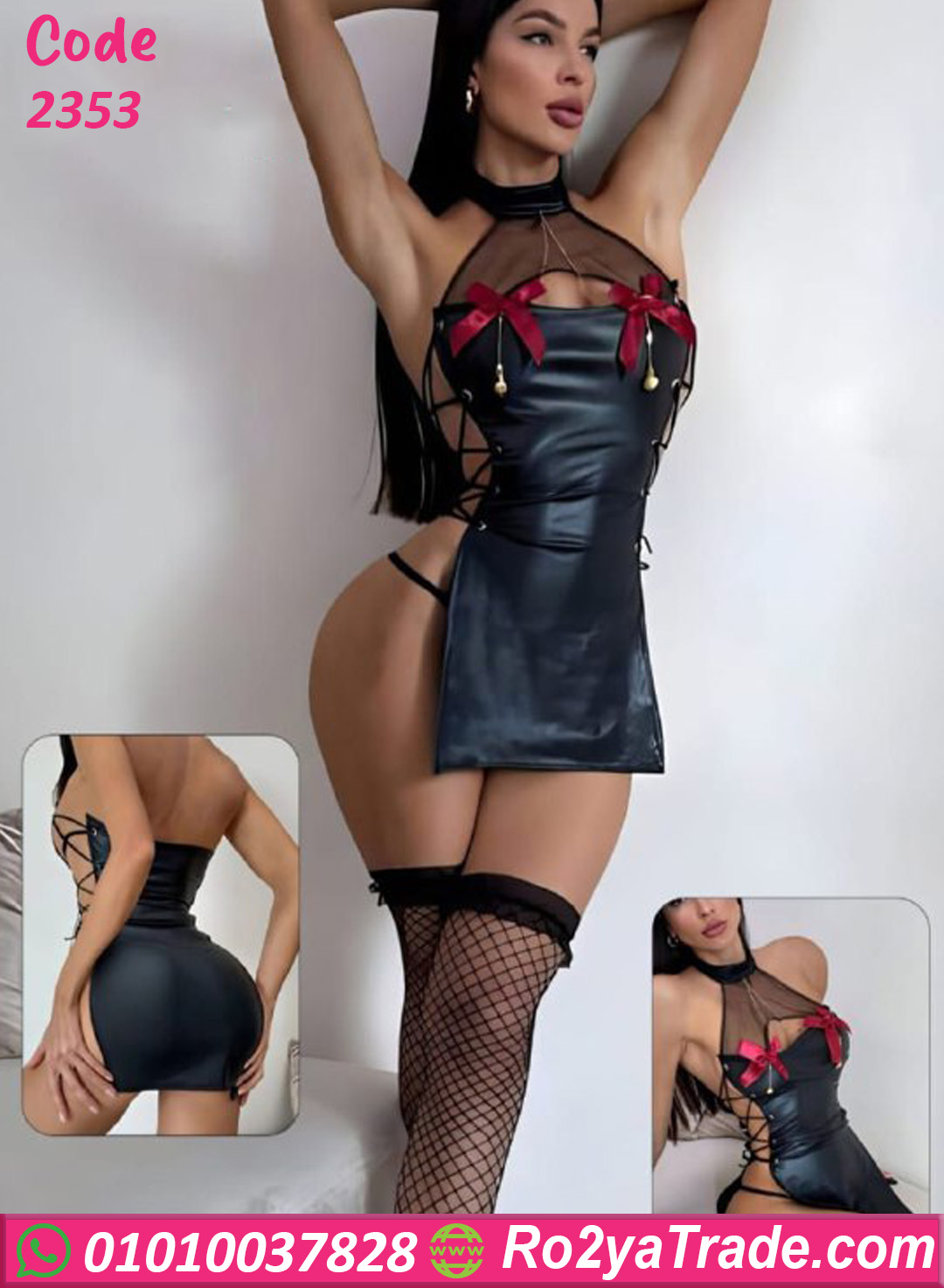 لانجري جلد مثير – كود 2353 من ماركة TOP STYLE بتصميم أنثوي جريء يجمع بين الأناقة والجاذبية. يتميز بخامة جلد صناعي لامعة مع تفاصيل شبك شفافة تضيف لمسة أنثوية جذابة.
