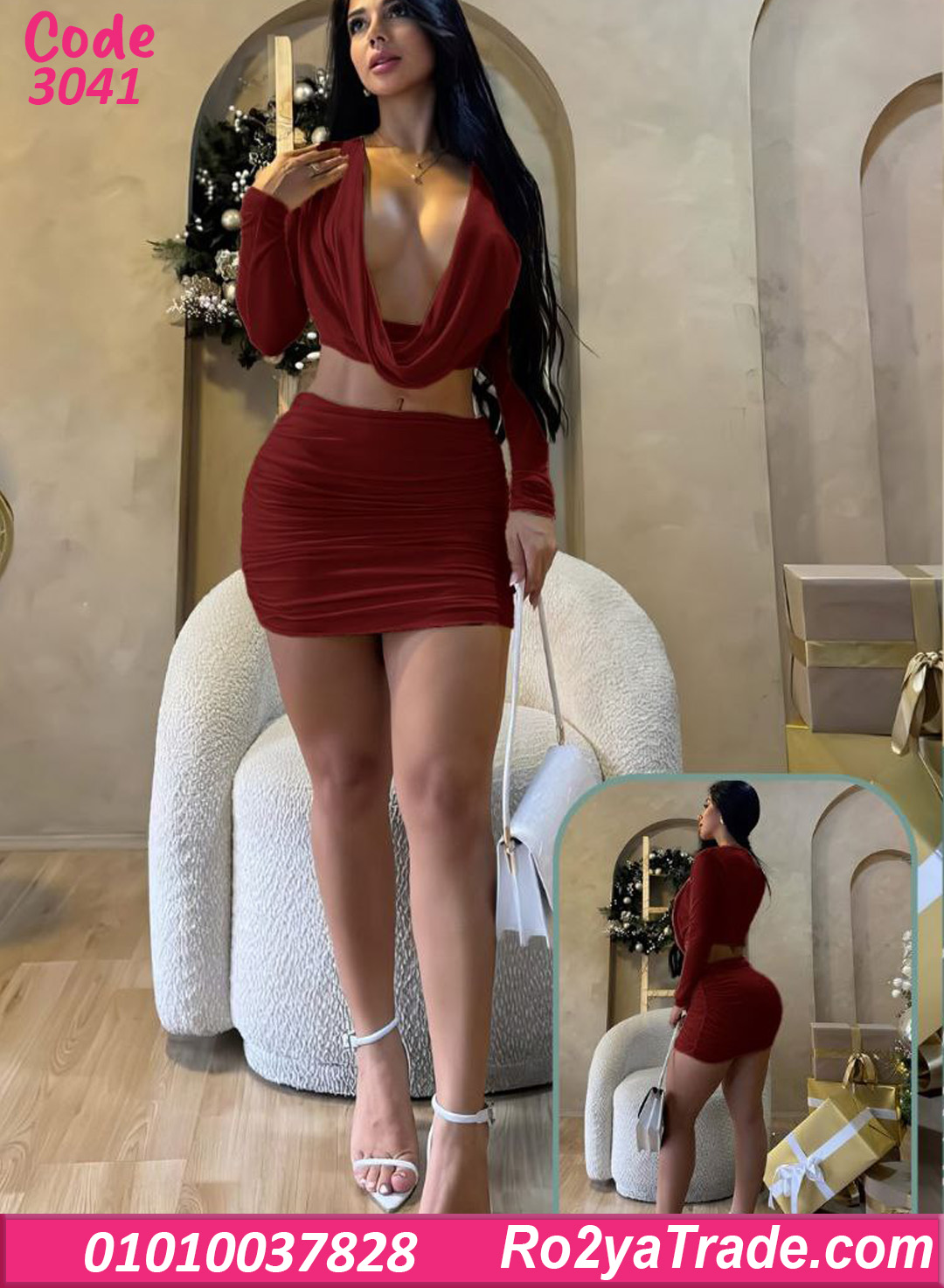 التصميم يأتي بأكمام طويلة مع قصة صدر واسعة تضيف لمسة أنثوية جذابة، بينما التنورة القصيرة مصممة بقماش مرن يبرز تفاصيل الجسم ويمنح مظهرًا أنيقًا وعصريًا.