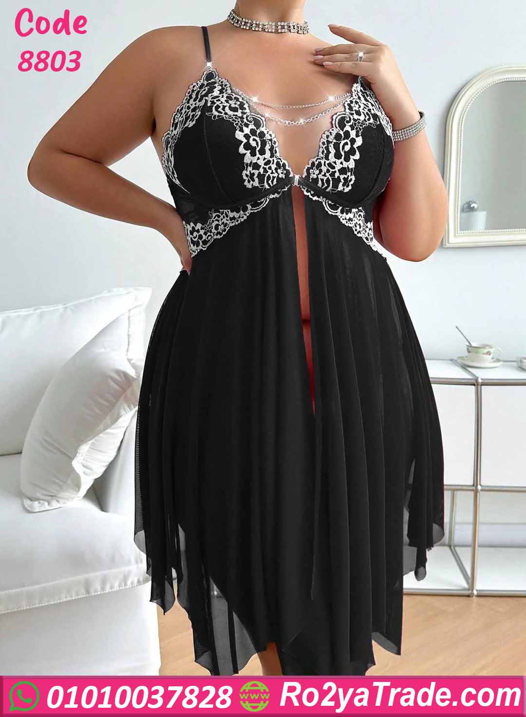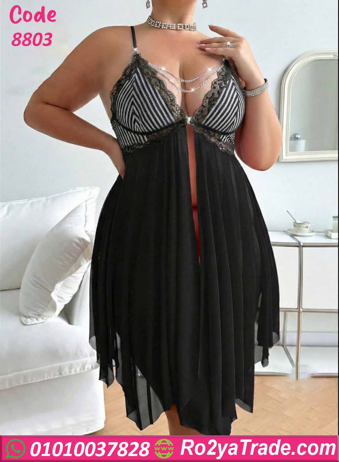 لانجري قصير كود 8803 من ماركة RoZana بتصميم أنيق يجمع بين الأنوثة والجاذبية. يتميز الجزء العلوي بتصميم مخطط مع دانتيل فاخر يبرز جمال التصميم، بالإضافة إلى سلاسل رفيعة تضيف لمسة فخامة مميزة.