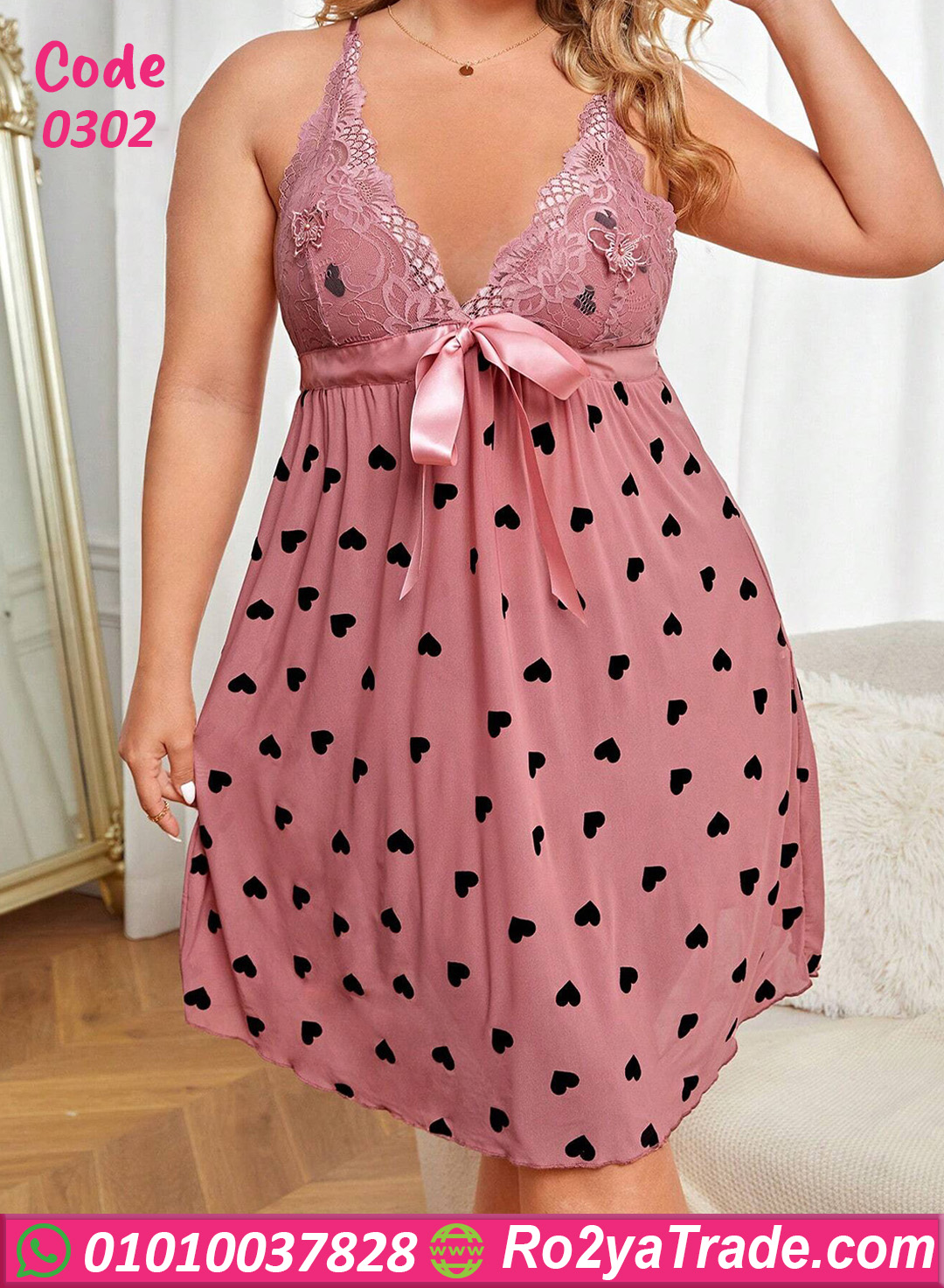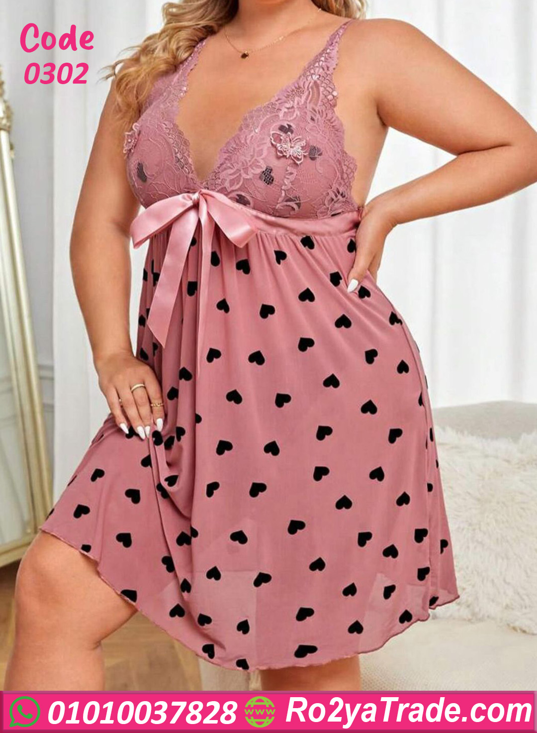 لانجري قصير كود 0302 تصميم أنثوي رقيق لكل بنت بتحب التفاصيل الناعمة والستايل الرومانسي. الموديل جاي بلون روز هادي مع نقشة قلوب سودة صغيرة بتدي شكل لطيف ومختلف جدًا.