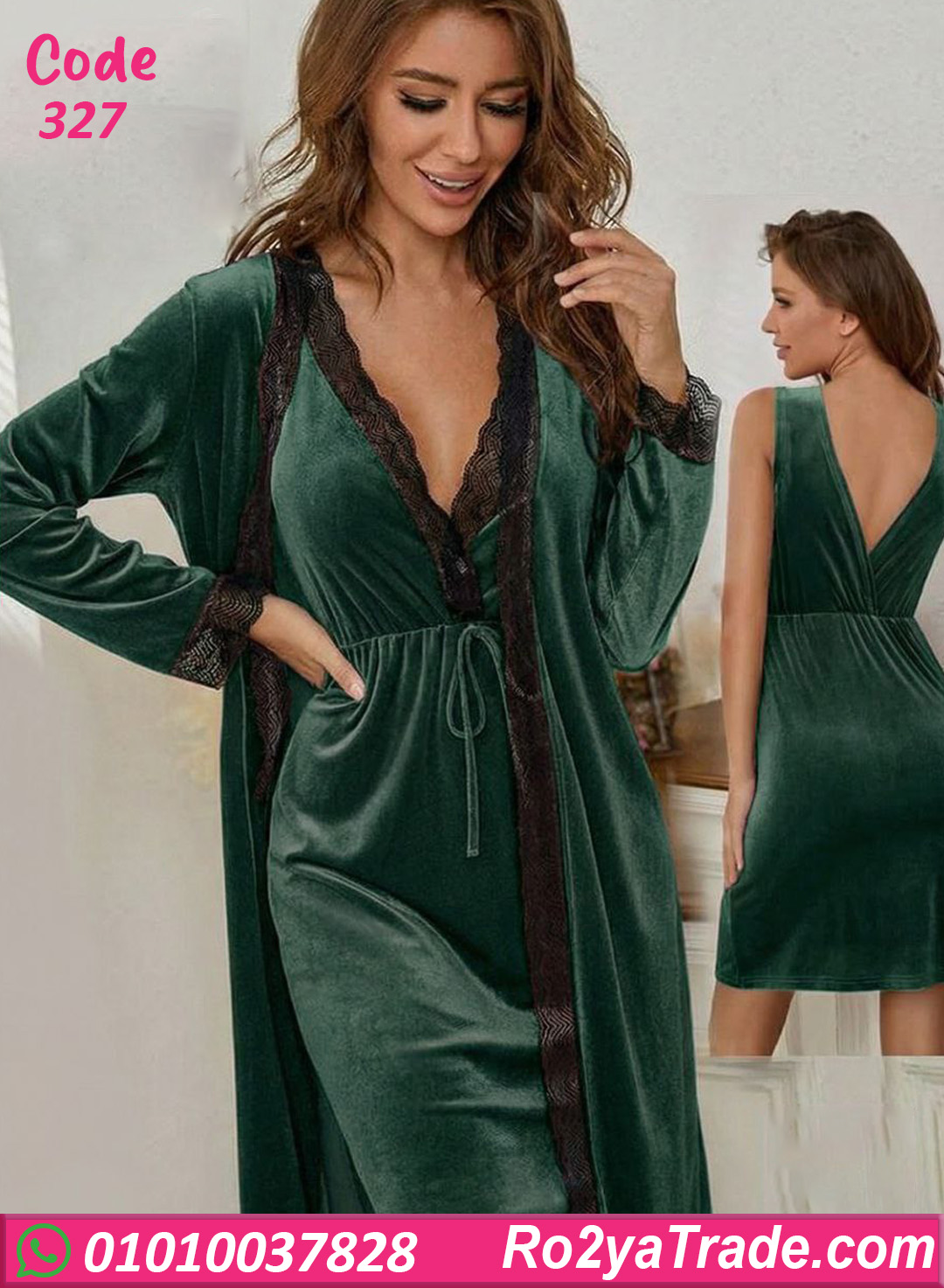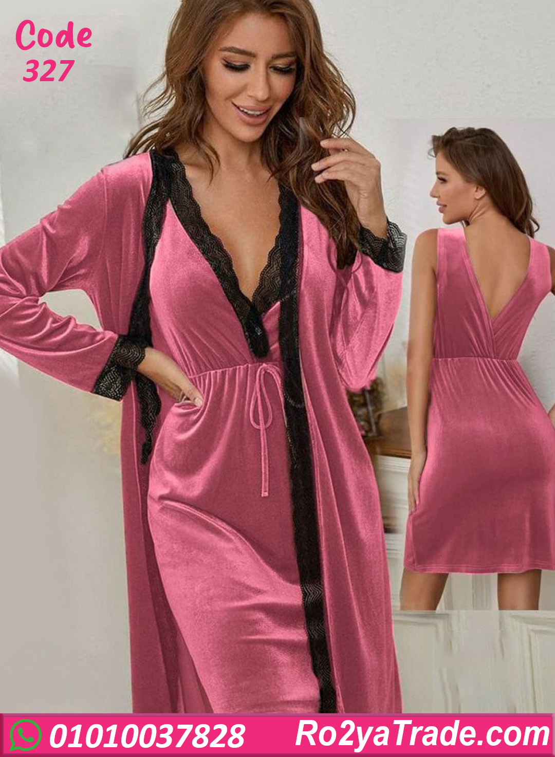 لانجري قصير حريمي مع روب من G.H بخامة مخمل ناعمة ودفاية، تصميم أنيق بتفاصيل دانتيل رقيقة بتبرز الأنوثة وتدي شكل جذاب ومريح في نفس الوقت.