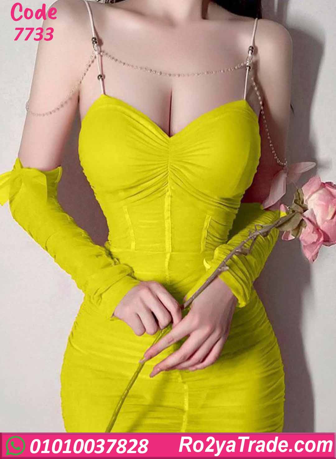 لانجري قصير بتفاصيل مميزة من السلاسل اللامعة على الحمالات والصدر بتدي شكل فخم وجذاب، تصميم ضيق على الجسم مع كشكشة خفيفة تبرز