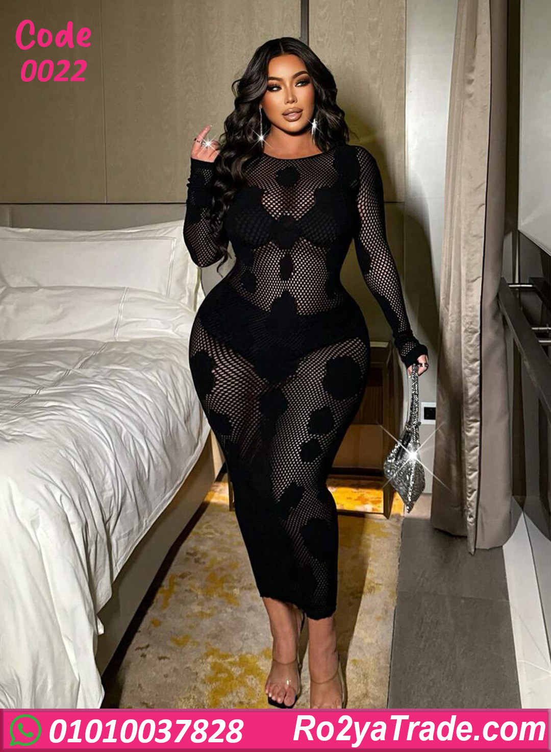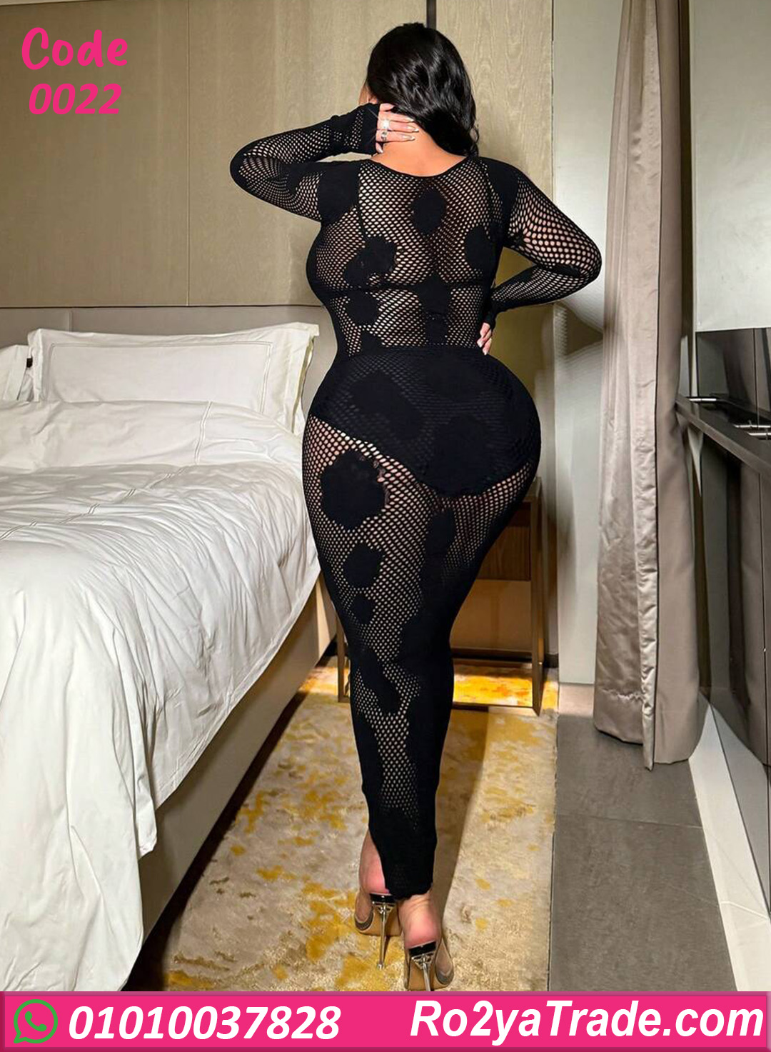 لانجري شبك بتصميم جريء وأنثوي، بقصّة ميدي ضيقة على الجسم بتبرز القوام بشكل جذاب ومميز، مناسب للبيج سايز وإطلالة واثقة ومختلفة.