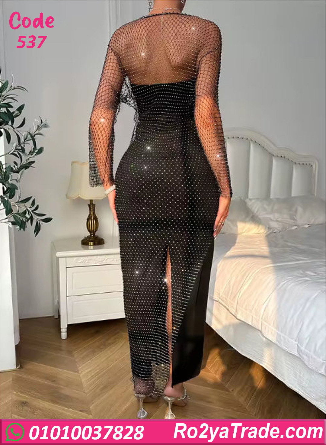 لانجري شبك طويل بتصميم أنيق وفخم، مزين بنقط ستراس لامعة بتدي لمسة رقي وشياكة، مناسب للسهرات الخاصة والإطلالات الجريئة الراقية.