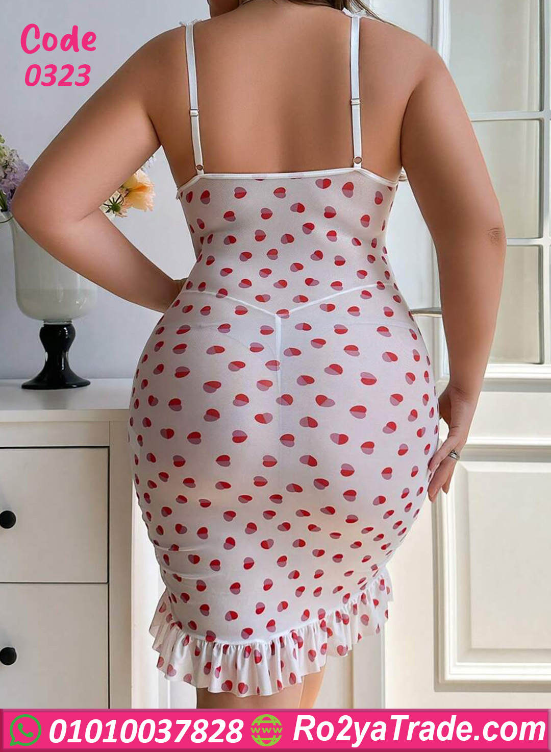 لانجري قصير كود 0323 تصميم جريء وأنثوي في نفس الوقت، معمول من خامة شبك خفيفة شفافة بنقشة قلوب حمراء صغيرة على أرضية بيضا، وده بيدي شكل رومانسي ودلع جدًا.