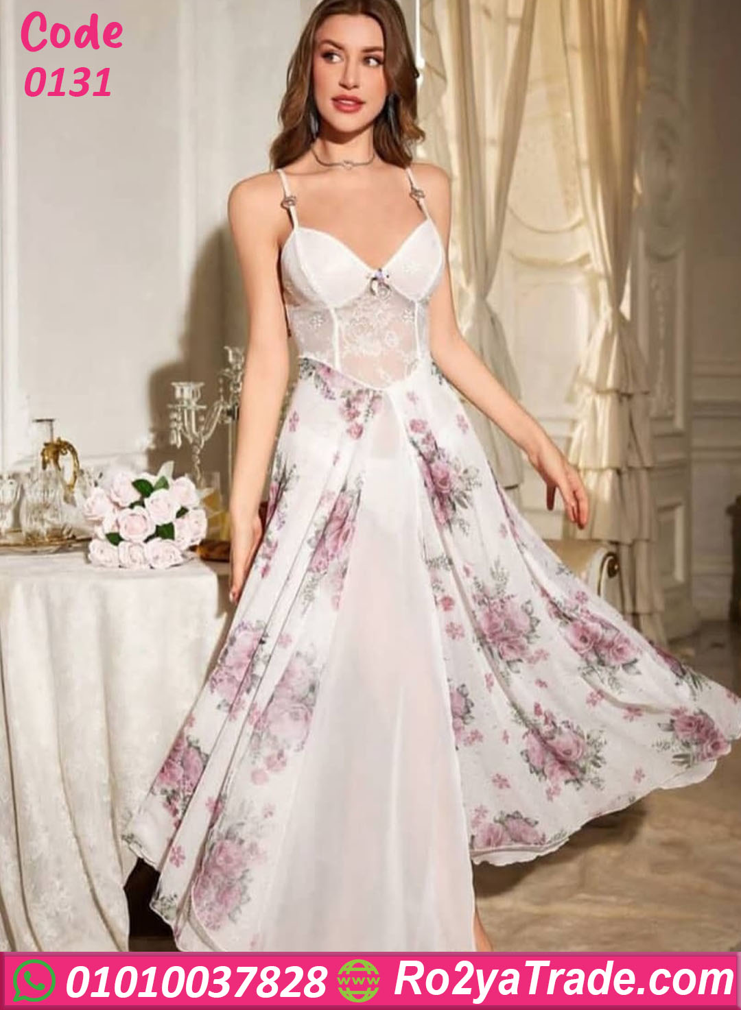 أما الجزء السفلي فيتميز بتصميم طويل واسع مزين بطبعات الورود الرقيقة التي تضيف لمسة رومانسية مميزة إلى التصميم، كما أن الفتحة الأمامية تمنح اللانجري شكل جذاب وأنثوي.