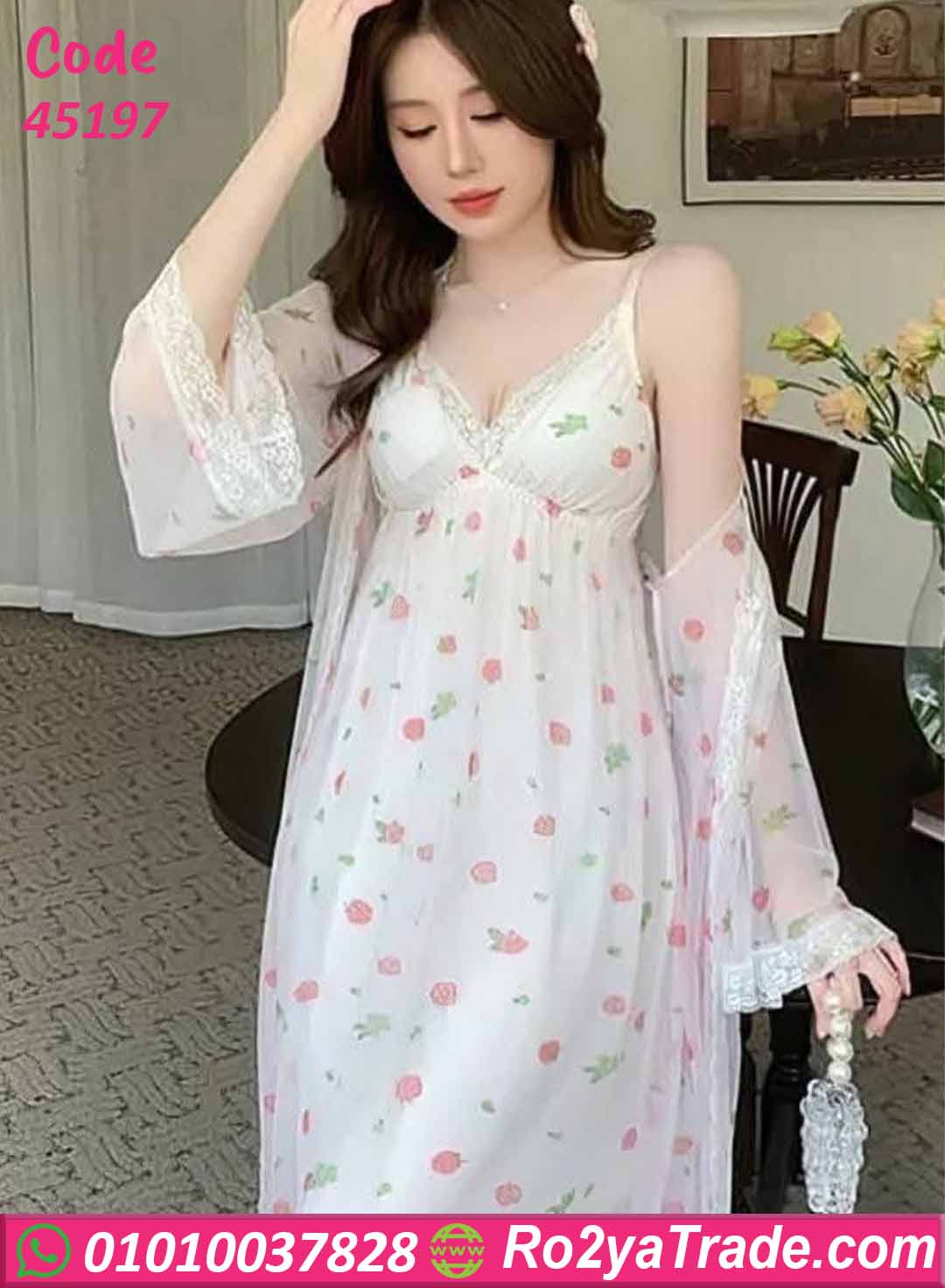 لانجري قصير بتصميم رومانسي مميز بخامة شيفون شفافة خفيفة على البشرة، مزين بنقشة ورد ناعمة ولمسات دانتيل عند الصدر والأكمام. القصة الواسعة المريحة بتدي إحساس حرية وأناقة في نفس الوقت، ومثالي للأوقات الخاصة ولمحبات الإطلالة الهادية والأنثوية.