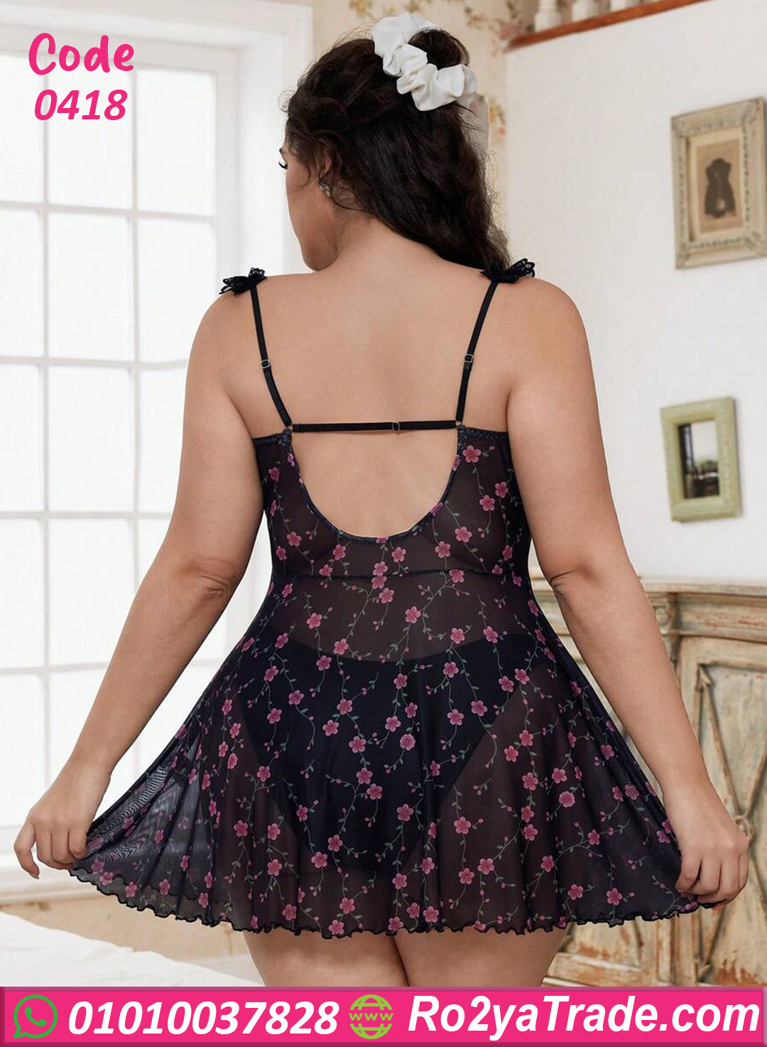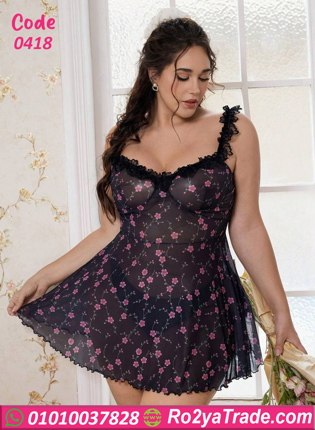 لانجري قصير بيج سايز بنقشة ورد رقيقة على شيفون أسود شفاف يخليكي دايمًا في قمة الأنوثة والدلع 🌸🖤