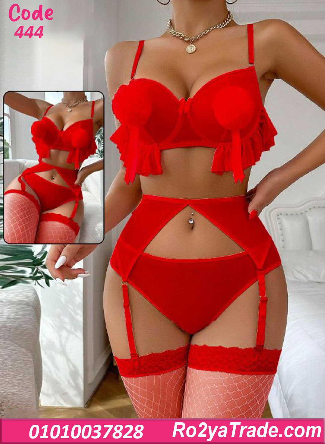 لانجري طقم دانتيل مثير مع حزام وجوارب – كود 444
