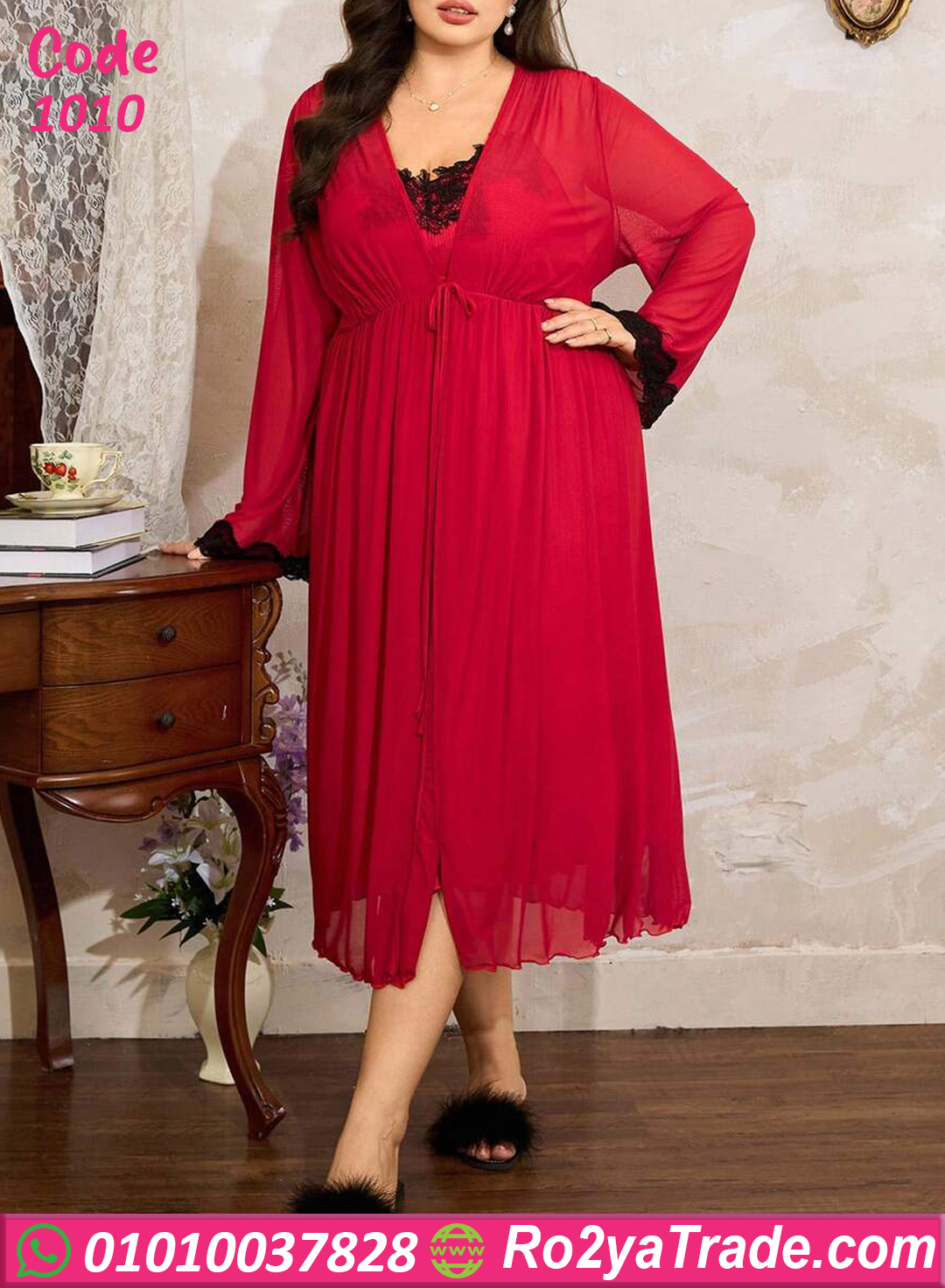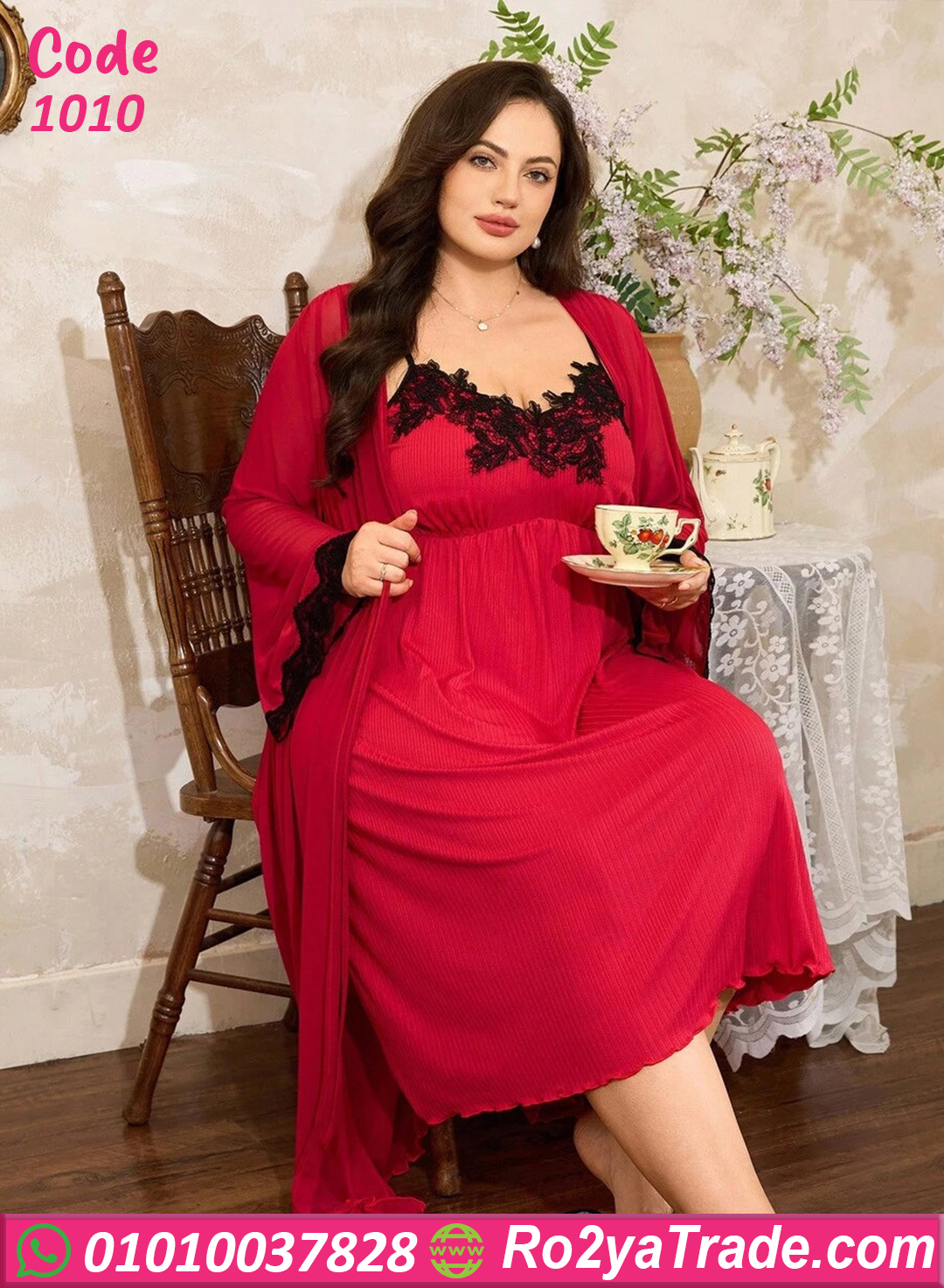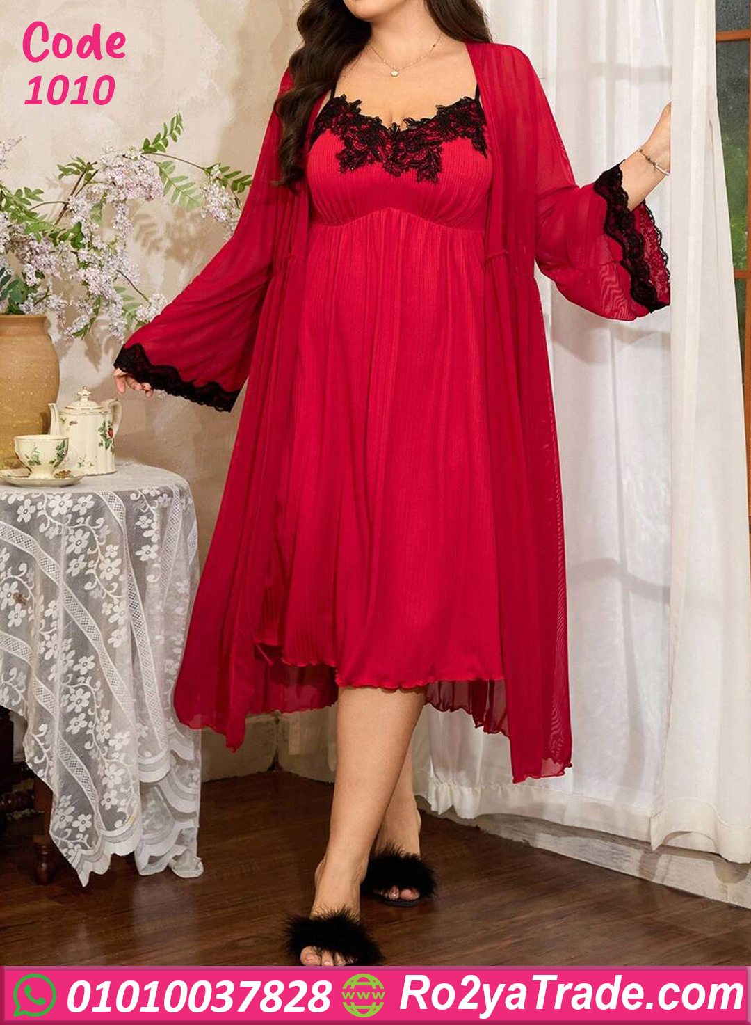 الطقم بيتكون من فستان لانجري لونه أحمر مثير بطبقة دانتيل أسود أنثوية عند منطقة الصدر، ومعاه روب بنفس اللون بياقة دانتيل بتدي شكل فخم ورومانسي جدًا ✨