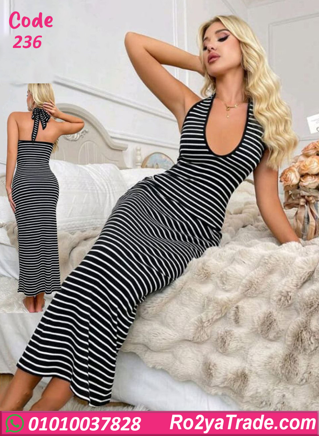 خامة ناعمة ومرنة بتحدد شكل الجسم وتبرز الأنوثة بشكل شيك. تصميم مخطط بخطوط رفيعة مع فتحة صدر أنيقة ورباط من الخلف، مناسب للبيت أو الأوقات الخاصة بإطلالة مميزة.