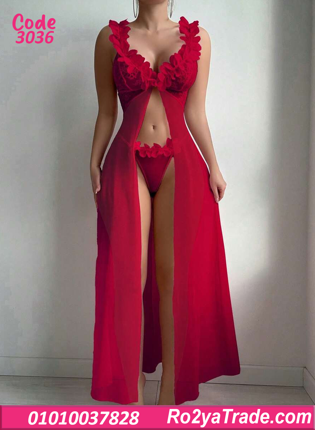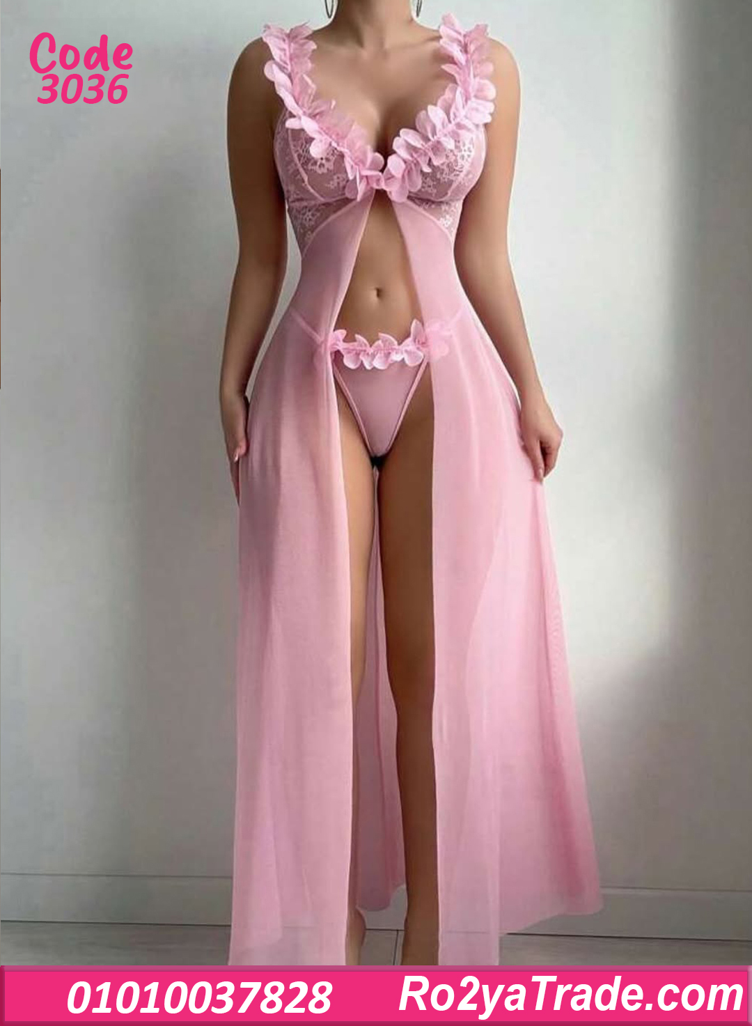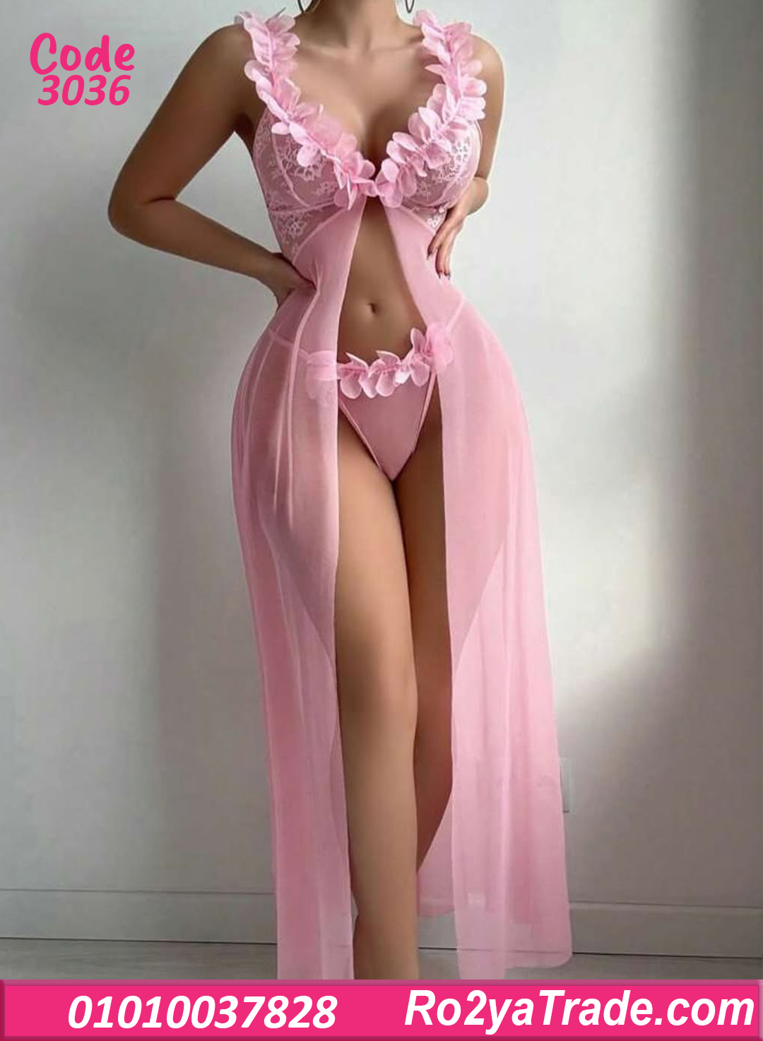 لانجري طويل مفتوح من الأمام بتفاصيل ورد 3D على الصدر والبكيني، تصميم ساحر يبرز جمال جسمك بأنوثة راقية.