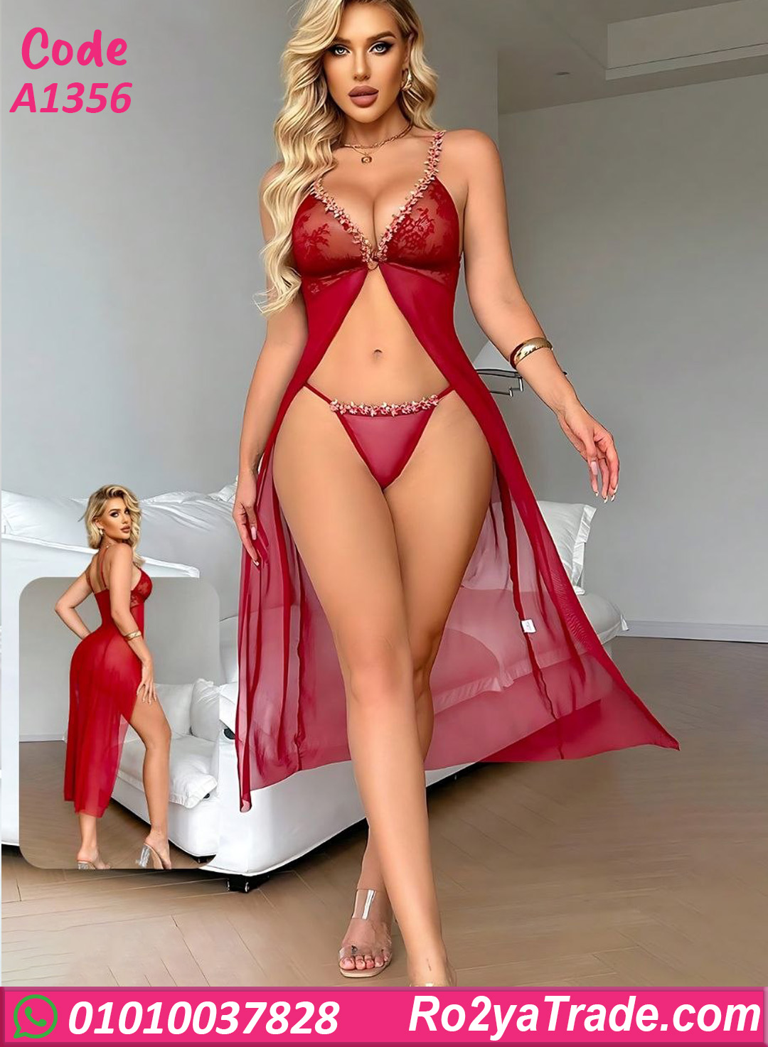 لانجري طويل حريمي بتصميم أنيق ومثير، خامته شيفون ناعمة وخفيفة مع دانتيل راقي على الصدر والحواف بيدي لمسة أنوثة وفخامة. الموديل مفتوح من الأمام بقصة جذابة وذيل طويل بيضيف حركة وانسيابية ناعمة، مناسب للإطلالات الخاصة واللحظات المميزة.