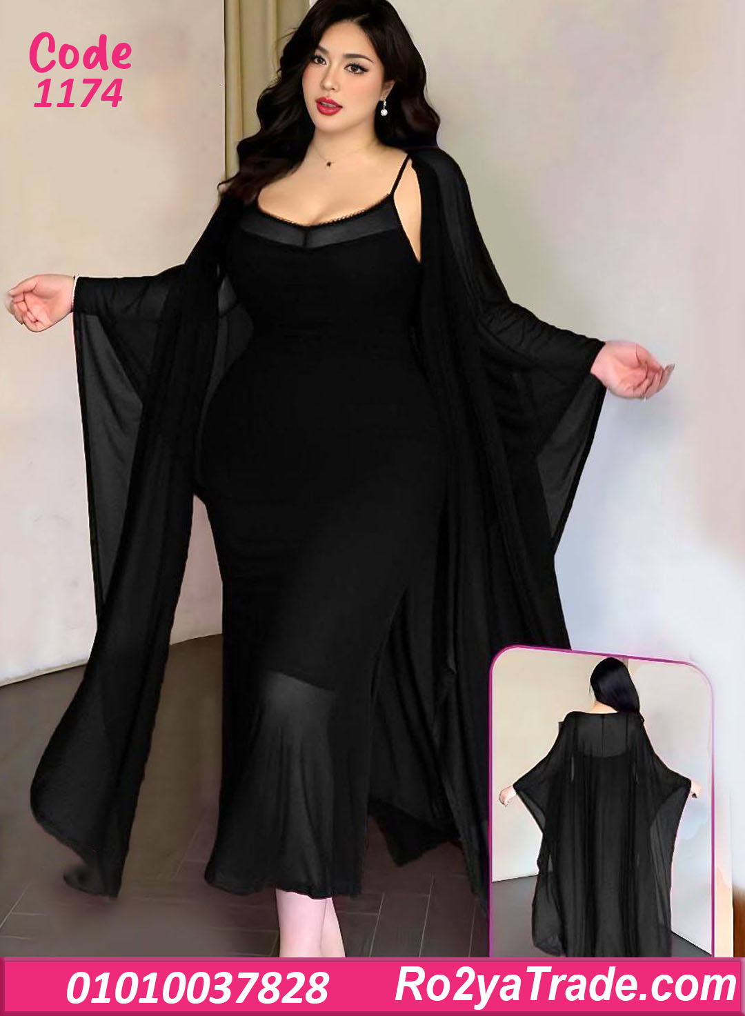 لانجري كود 1174 مكون من: ✔️ فستان طويل حمالات بتصميم ضيق على الجسم يبرز القوام بشكل أنيق. ✔️ روب شيفون طويل واسع بأكمام مفتوحة بيدي حركة وانسيابية جذابة جدًا.