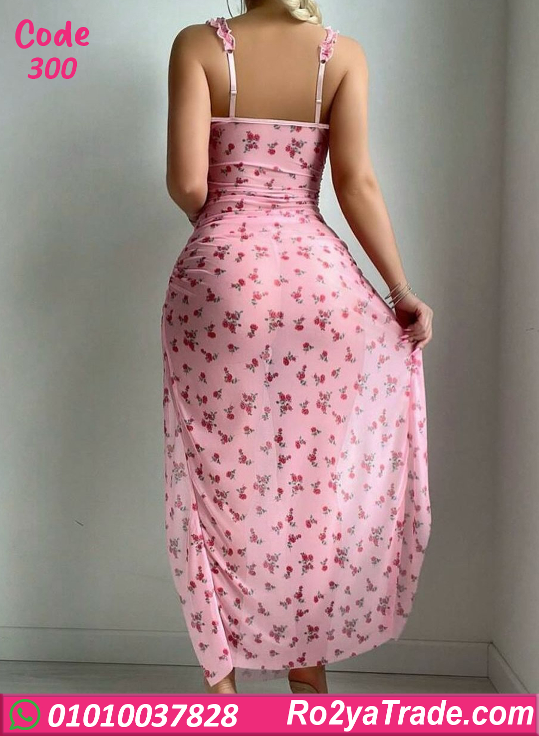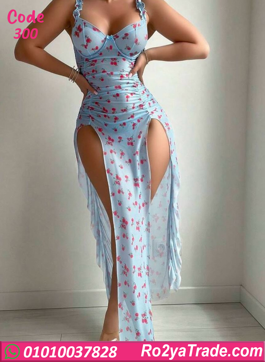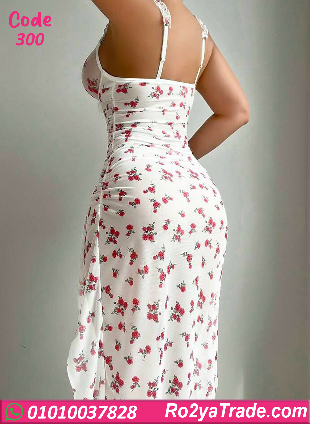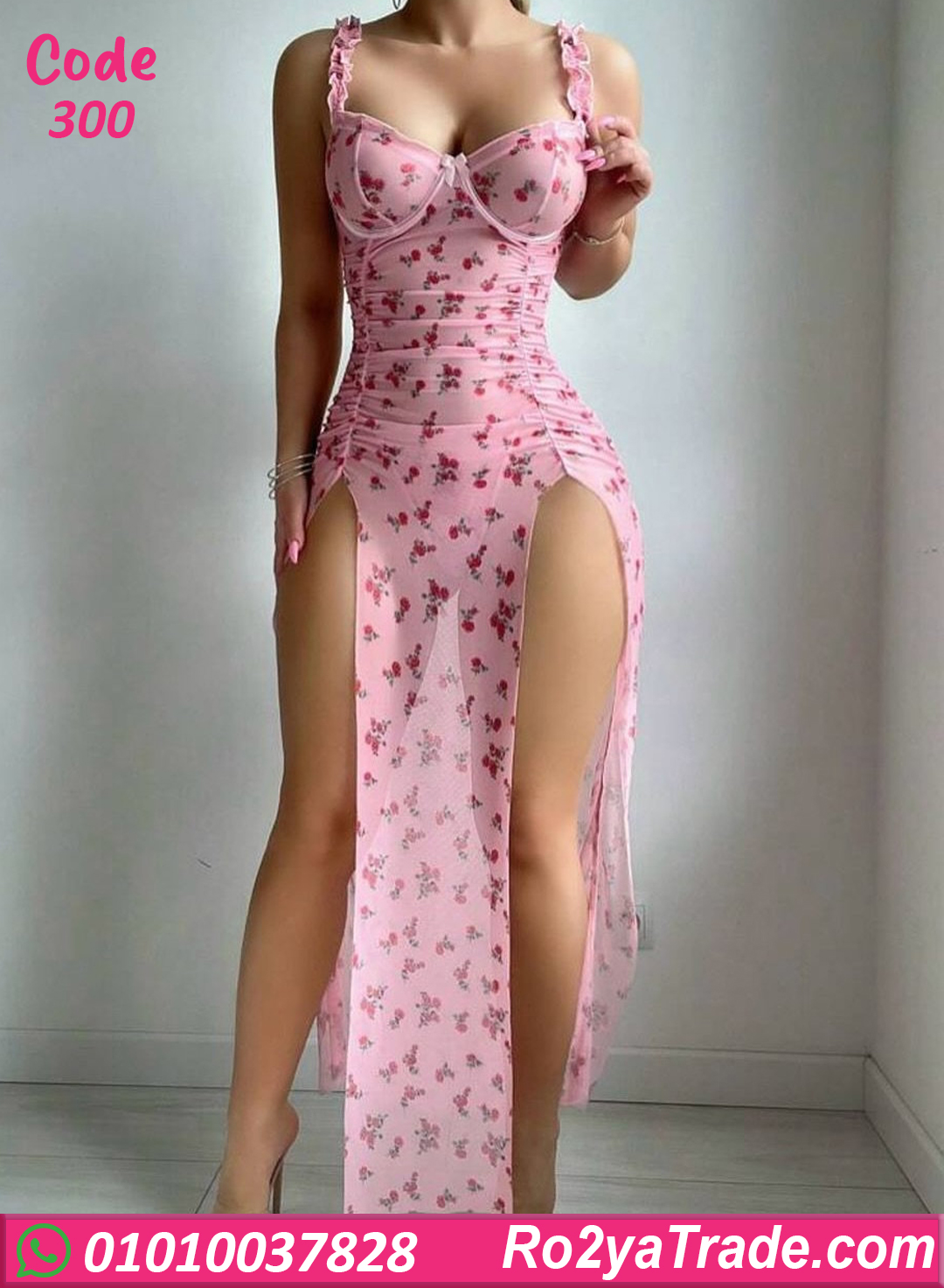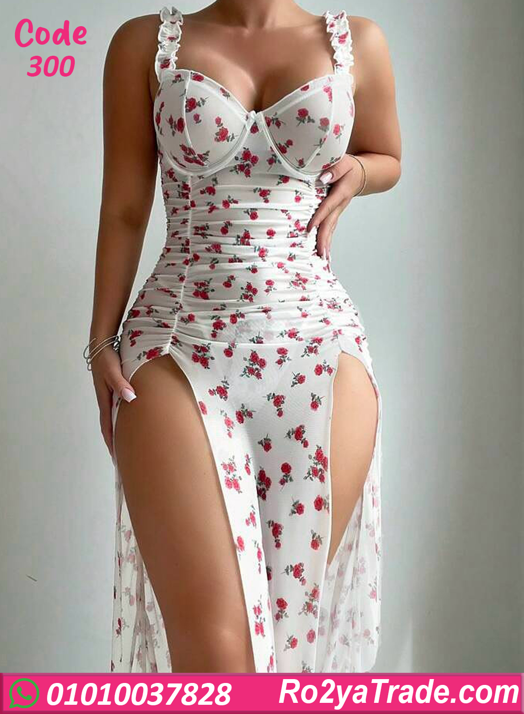 خامة ناعمة وخفيفة على الجسم، مزود بحمالات رفيعة وكاسات بتدي دعم وشكل جذاب. الموديل مزين بنقشة ورد رقيقة مع فتحات جانبية طويلة بتدي لمسة أنوثة جريئة ومميزة. مناسب للسهرات الخاصة، شهر العسل،