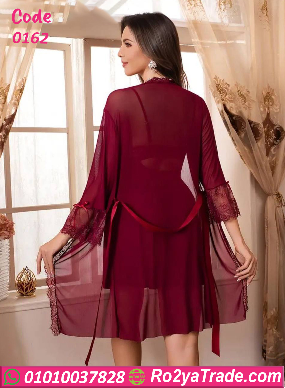 لانجري 0162 من الموديلات اللي بتجمع ما بين الإغراء والنعومة في نفس الوقت. الجزء العلوي دانتيل فخم بتفاصيل راقية بتحدد منطقة الصدر بشكل أنثوي جذاب، مع حمالات خفيفة بتدي ثبات وراحة. الجيبة من قماش خفيف ناعم على الجسم وحركته رقيقة جدًا. الروب الشيفون عليه دانتيل على الأطراف بيكمل اللوك بشكل خيالي ويديكي إطلالة مميزة ومختلفة. مناسب للمتزوجات والبنات اللي بتحب موديلات كوول وشيك في نفس الوقت. سهل اللبس وخفيف وعملي.