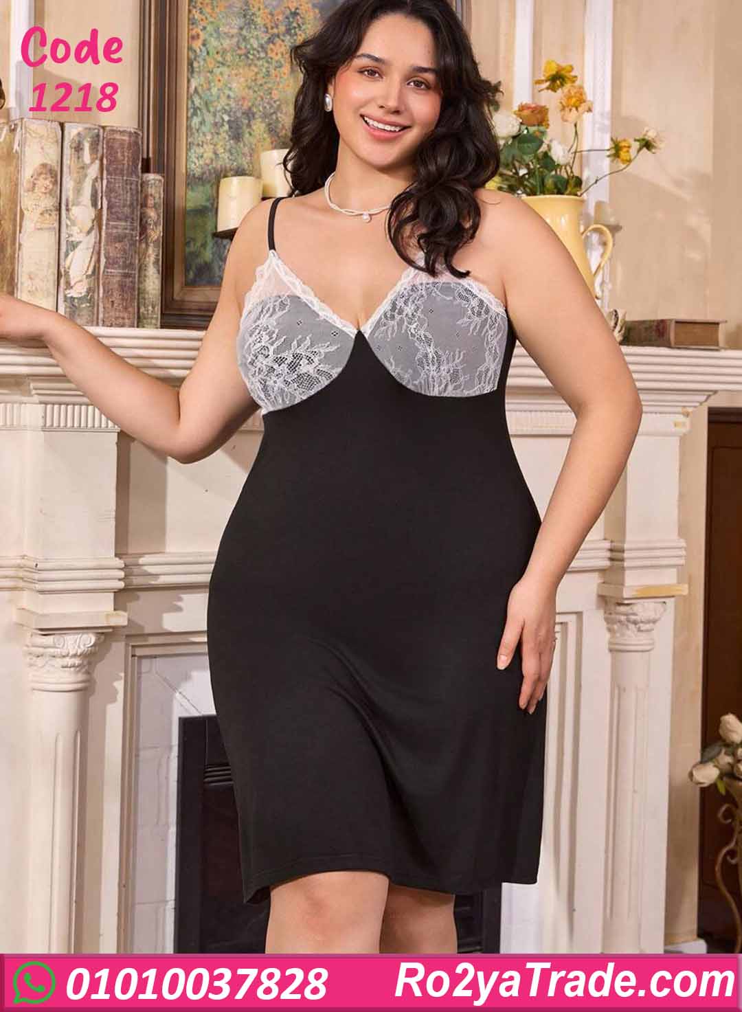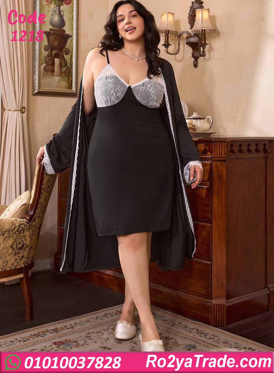 لانجري قصير باللون الأسود مع روب بنفس اللون، مزوّد بدانتيل أبيض على الصدر وعلى أطراف الروب، تصميم أنثوي شيك يدي شكل راقي ومثير وفي نفس الوقت مريح في اللبس.