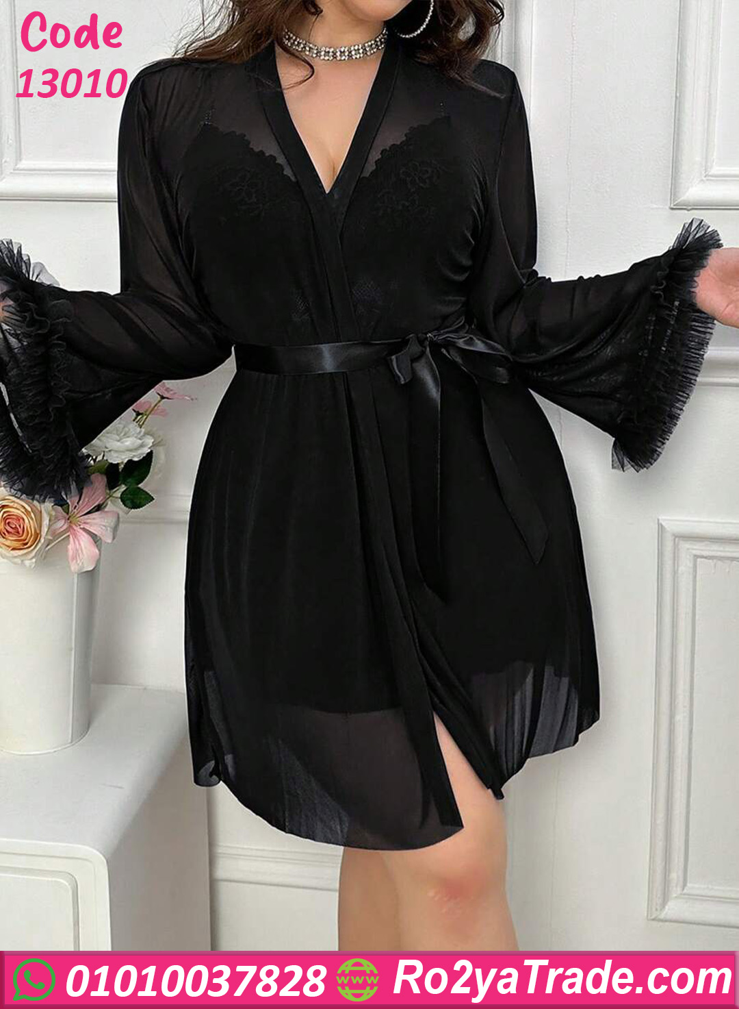 كما يأتي مع روب شيفون خفيف بأكمام واسعة يضيف لمسة فخمة ورومانسية للقطعة ويجعل الطقم أكثر أناقة وتميزًا.