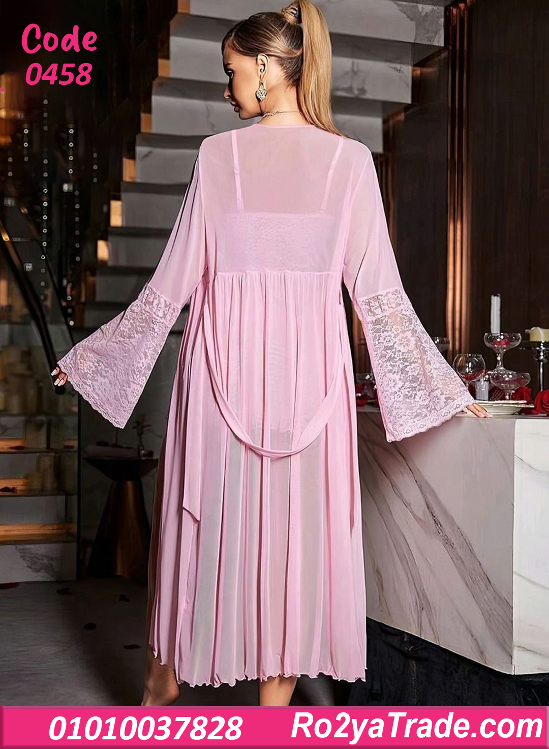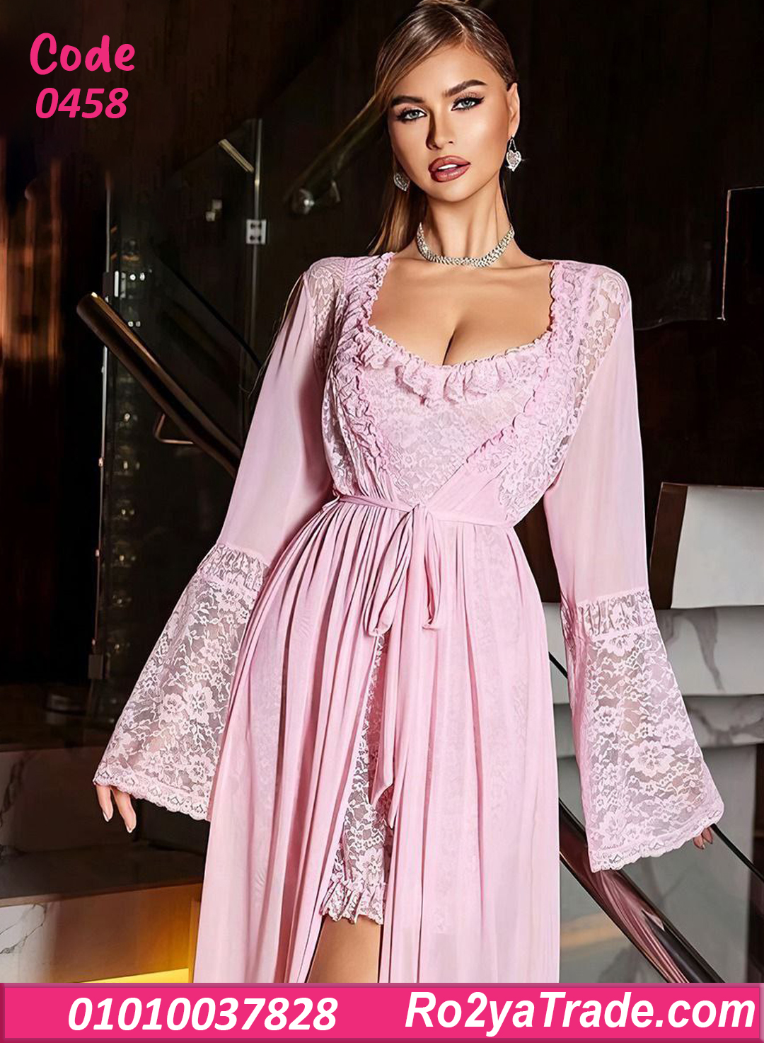 لانجري قصير دانتيل وردي مع روب طويل شيفون لإطلالة رومانسية راقية تجمع بين الأنوثة والفخامة.