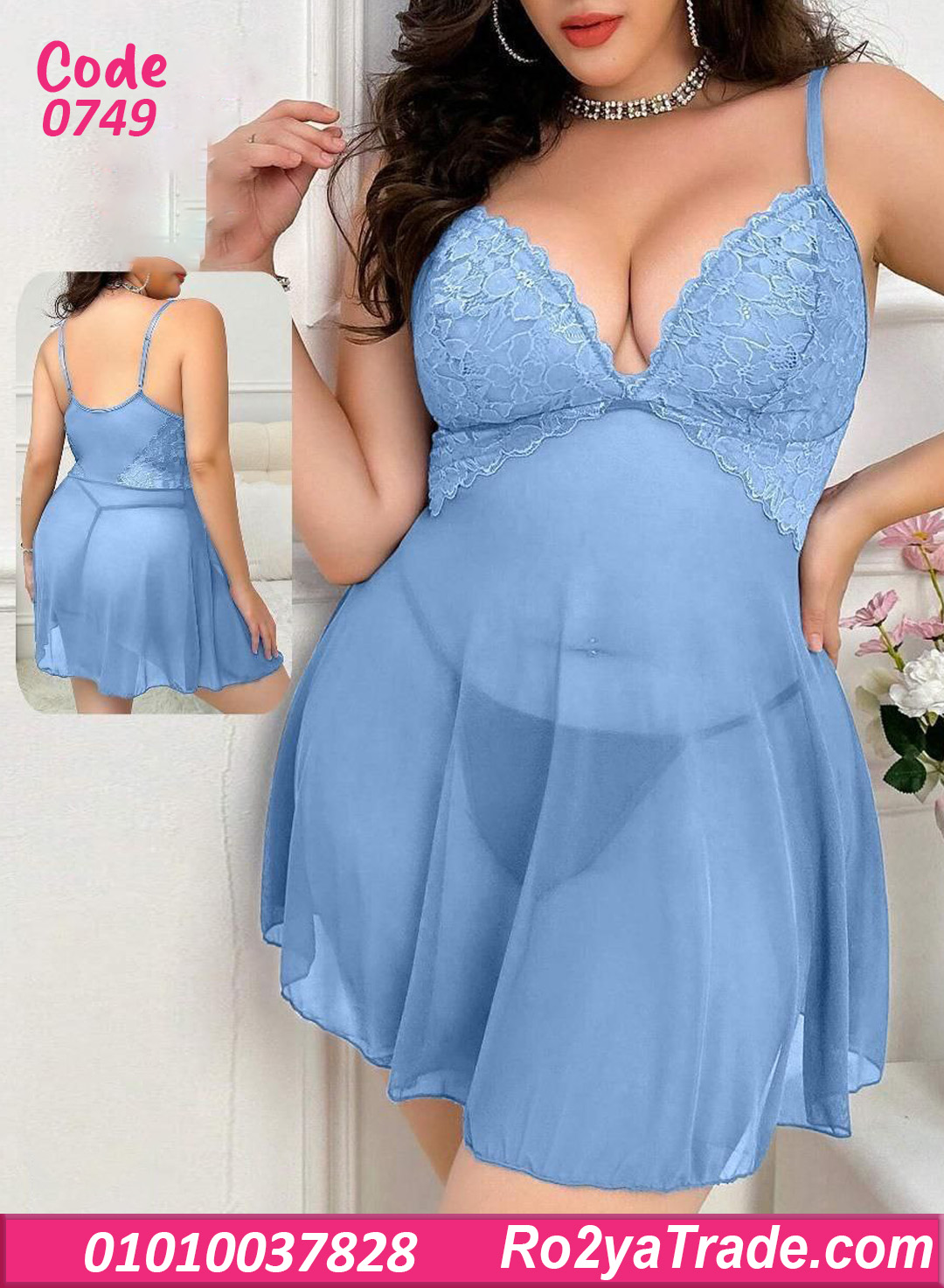 لانجري كود 0749 عبارة عن: ✔️ قميص نوم قصير بحمالات رفيعة قابلة للتعديل. ✔️ صدر دانتيل مبطن خفيف بقصة V جذابة. ✔️ قصة واسعة من تحت بشيفون انسيابي بيدي حركة ناعمة وأنثوية.