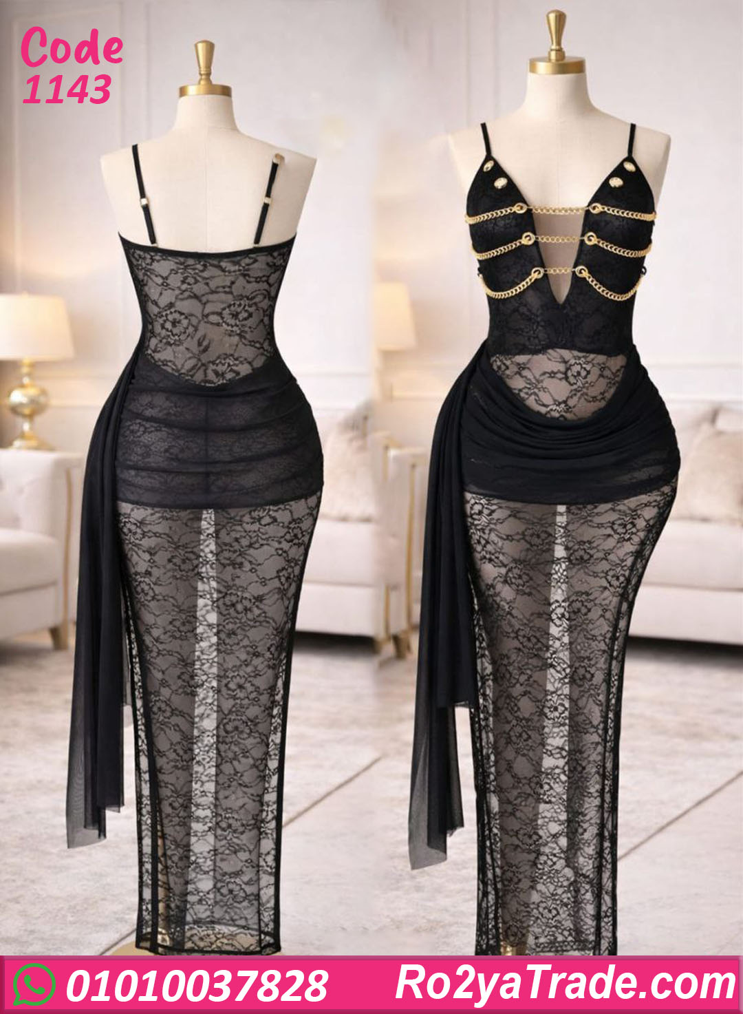 لانجري حريمي بتصميم جريء وفخم، خامته دانتيل ناعم وشفاف بيدي إحساس أنوثة قوي، مع تفاصيل سلاسل معدنية ذهبية على الصدر بتضيف لمسة فاخرة وجريئة. الموديل بقصة مجسمة بتبرز القوام بشكل أنيق، مع تنورة دانتيل طويلة بفتحة جانبية لإطلالة مثيرة ومميزة جدًا، مناسب للسهرات الخاصة واللحظات اللي محتاجة حضور مختلف.