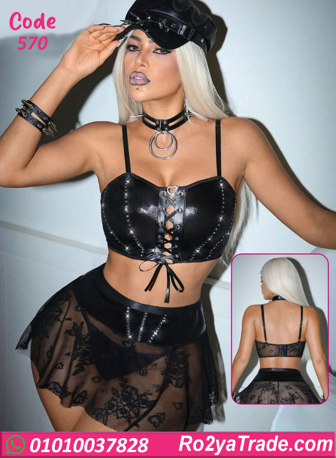 لانجري ميني جيب بتصميم جريء وعصري، مكوّن من توب جلد برباط أمامي مع ميني جيب دانتيل شفافة، إطلالة قوية وجذابة لمحبي الستايل المختلف واللافت.