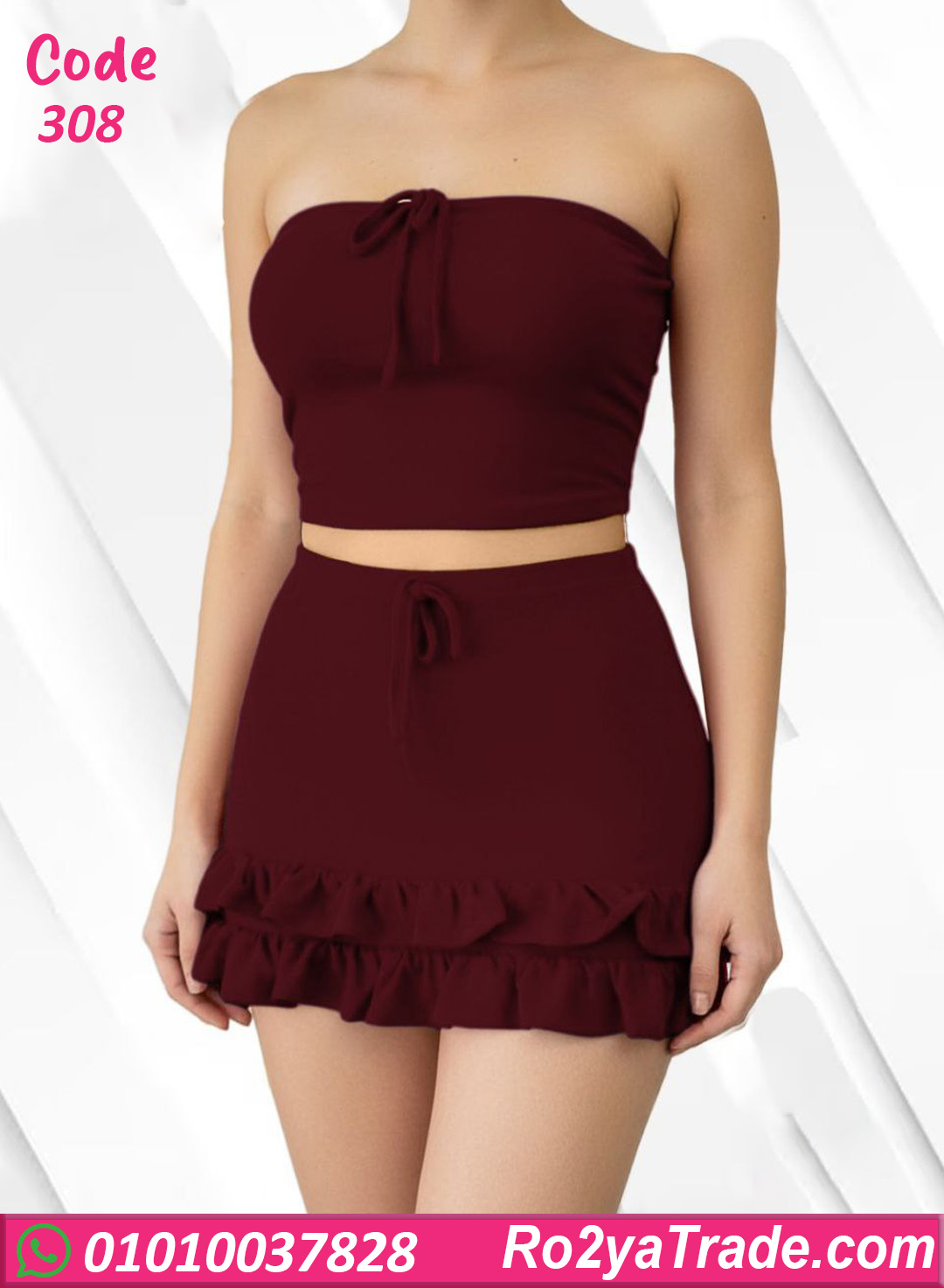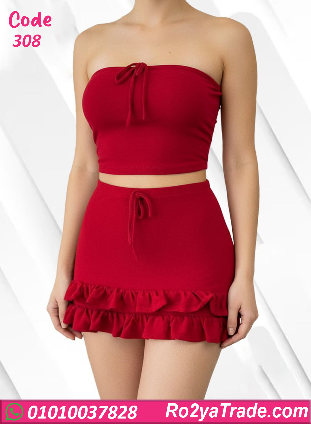 الطقم مكوّن من توب كت بدون حمالات مع ميني جيب قصيرة بكشكشة من أسفل ورباط عند الوسط، تصميم أنيق ومناسب للراحة بإطلالة أنثوية.