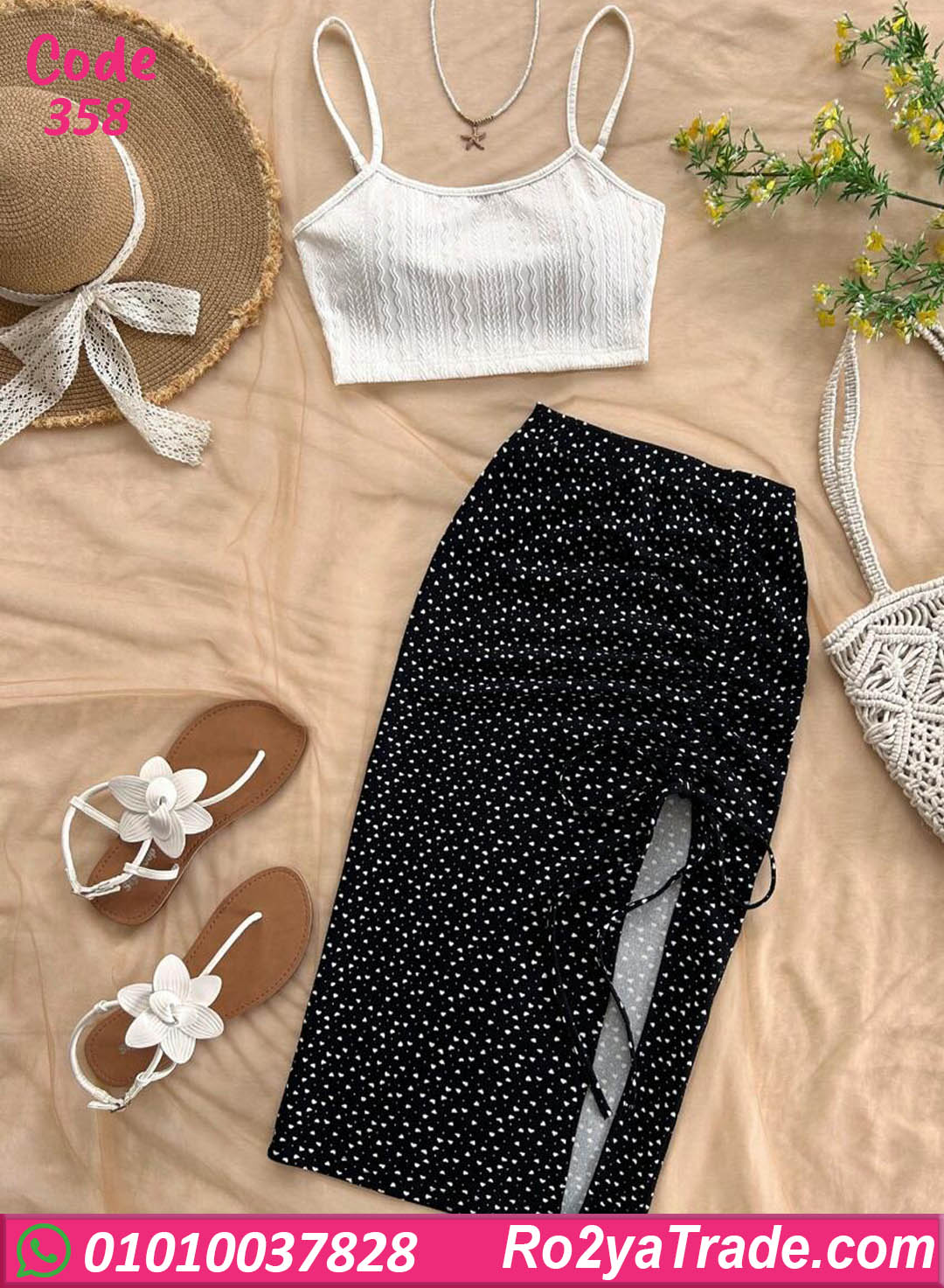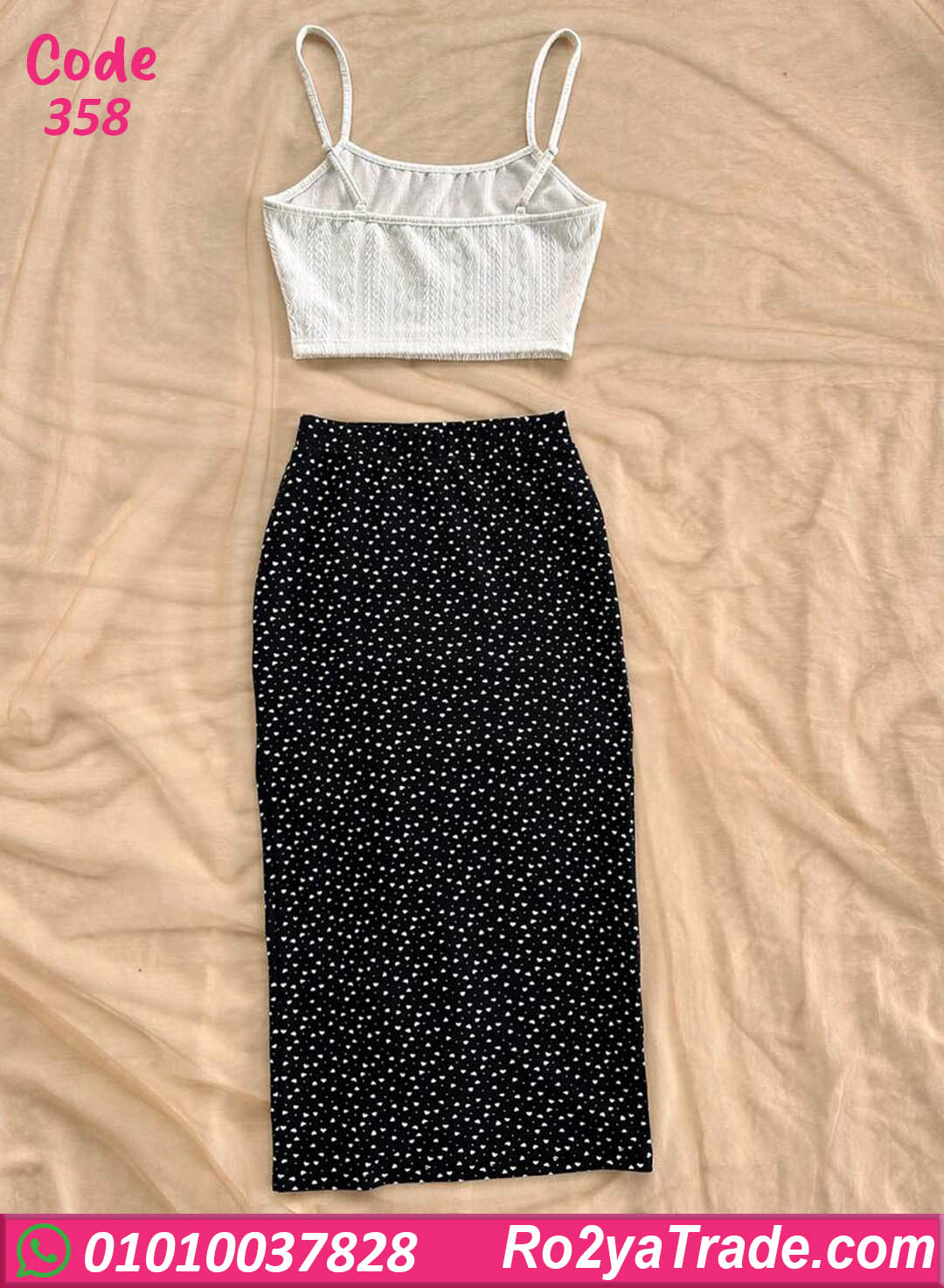 طقم مكوّن من توب أبيض بحمالات رفيعة وجيبة ميني سوداء منقطة بفتحة جانبية شيك،