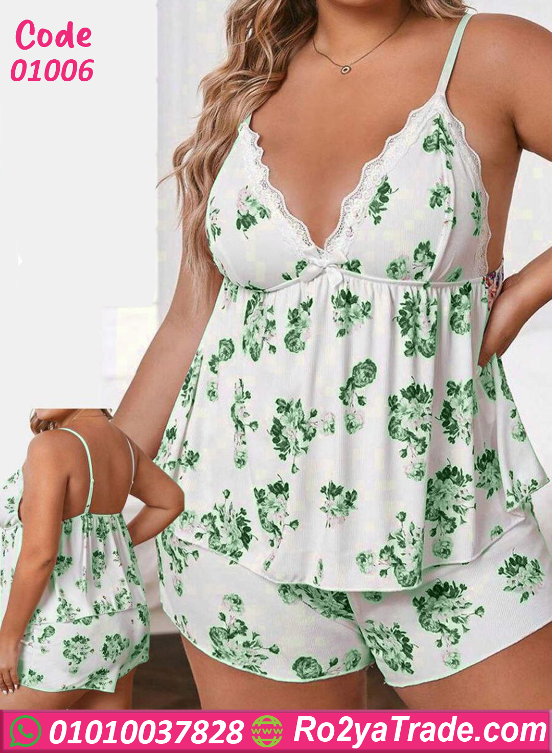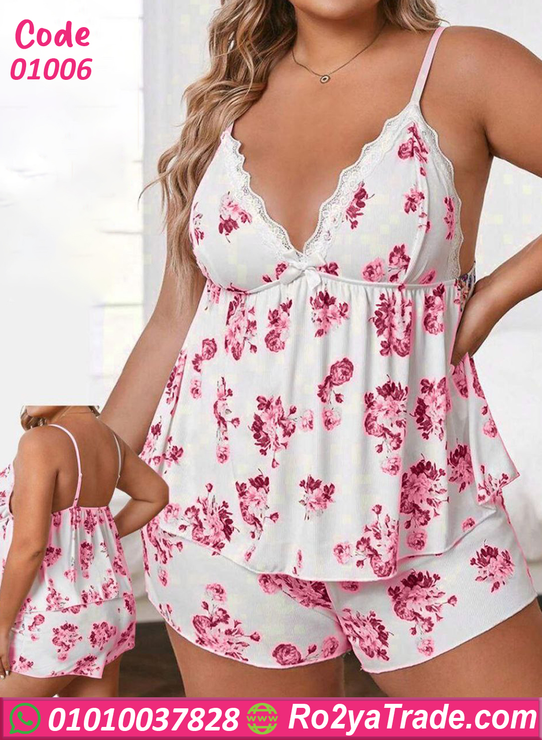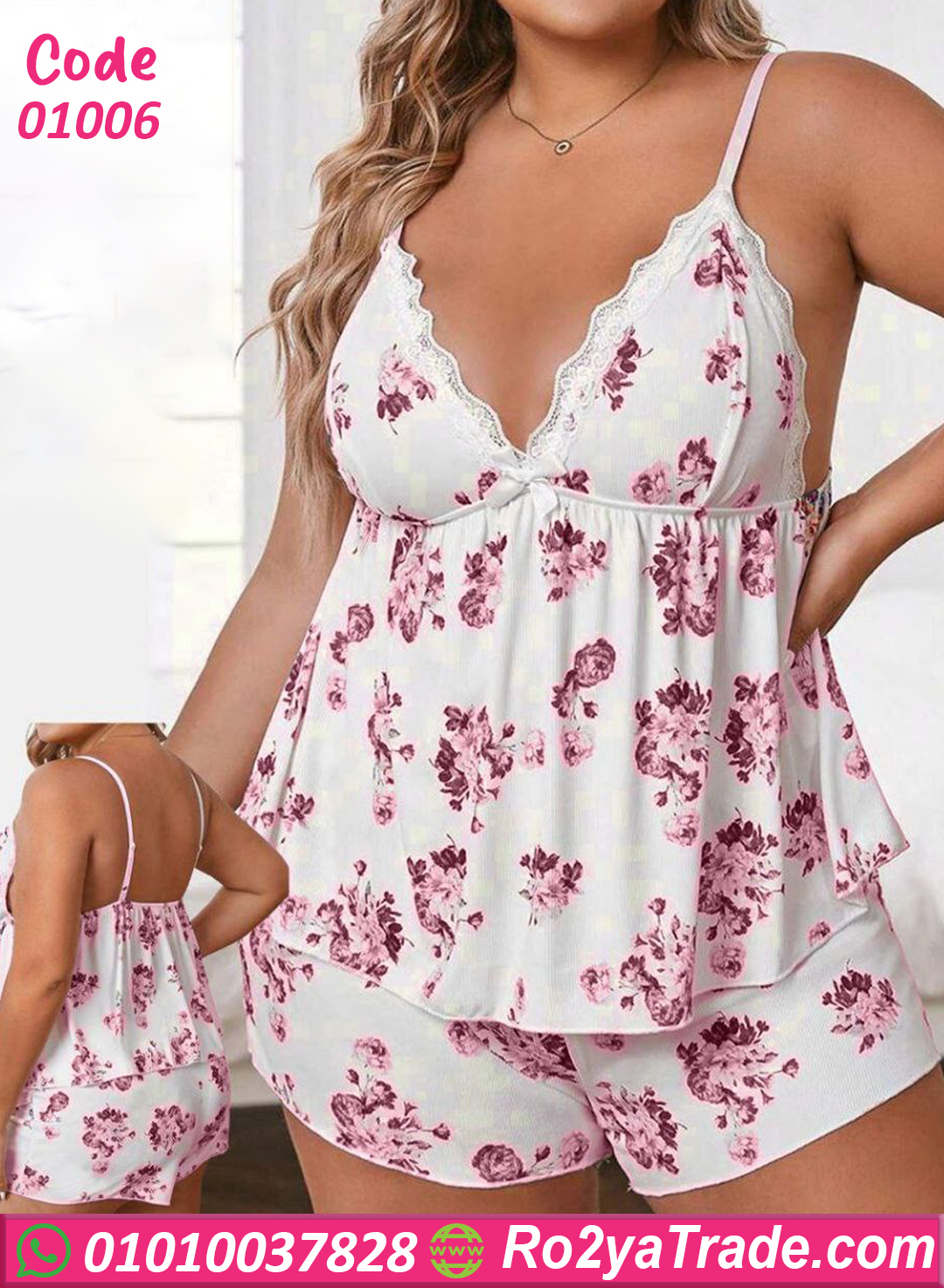 القطعة العلوية بحمالات رفيعة وفيونكة من قدام بتدي شكل أنوثي جذاب، وكمان الدانتيل على منطقة الصدر عامل لمسة فخمة. الشورت واسع ومريح ومش بيشد على الجسم، بخامة قطن مريحة في اللبس خصوصًا مع الحر.