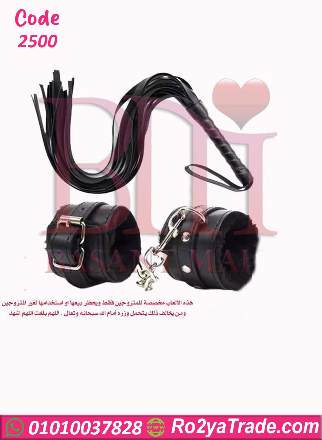 الطقم يجمع بين كلبشات جلد ناعمة مبطنة بخامة مريحة لضمان راحة أثناء الاستخدام، بالإضافة إلى كرباج أنيق بخيوط ناعمة تضيف لمسة من الغموض والرومانسية بين الزوجين.