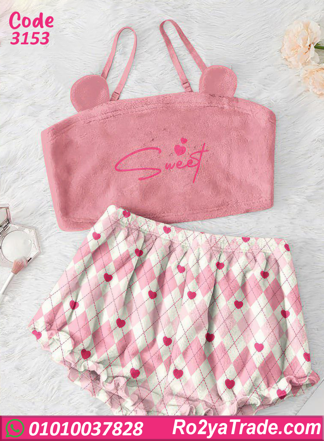 التصميم مكوّن من توب كت بسيط مع هوت شورت بنقشة قلوب ناعمة بتدي شكل أنثوي ولطيف جدًا.