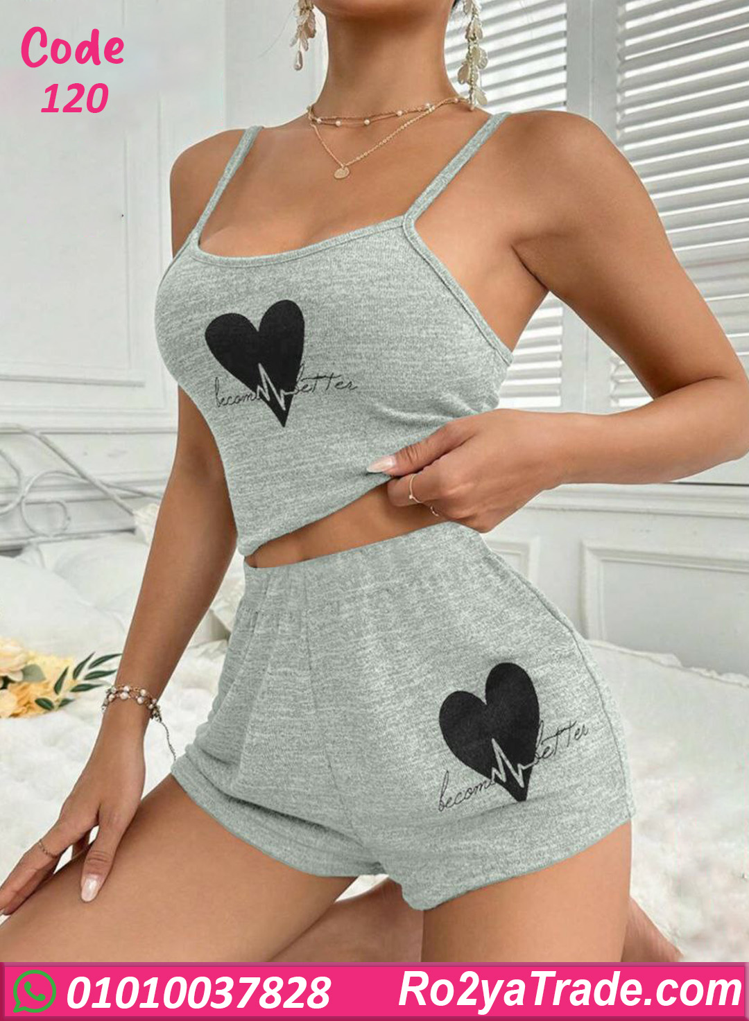 هوت شورت حريمي صيفي شيك وخفيف، مكوّن من توب بحمالات وبنطلون قصير بلون هادي ورسمة قلب أنيقة، مناسب للبس اليومي في البيت وبيوفر راحة وانتعاش في أيام الصيف.