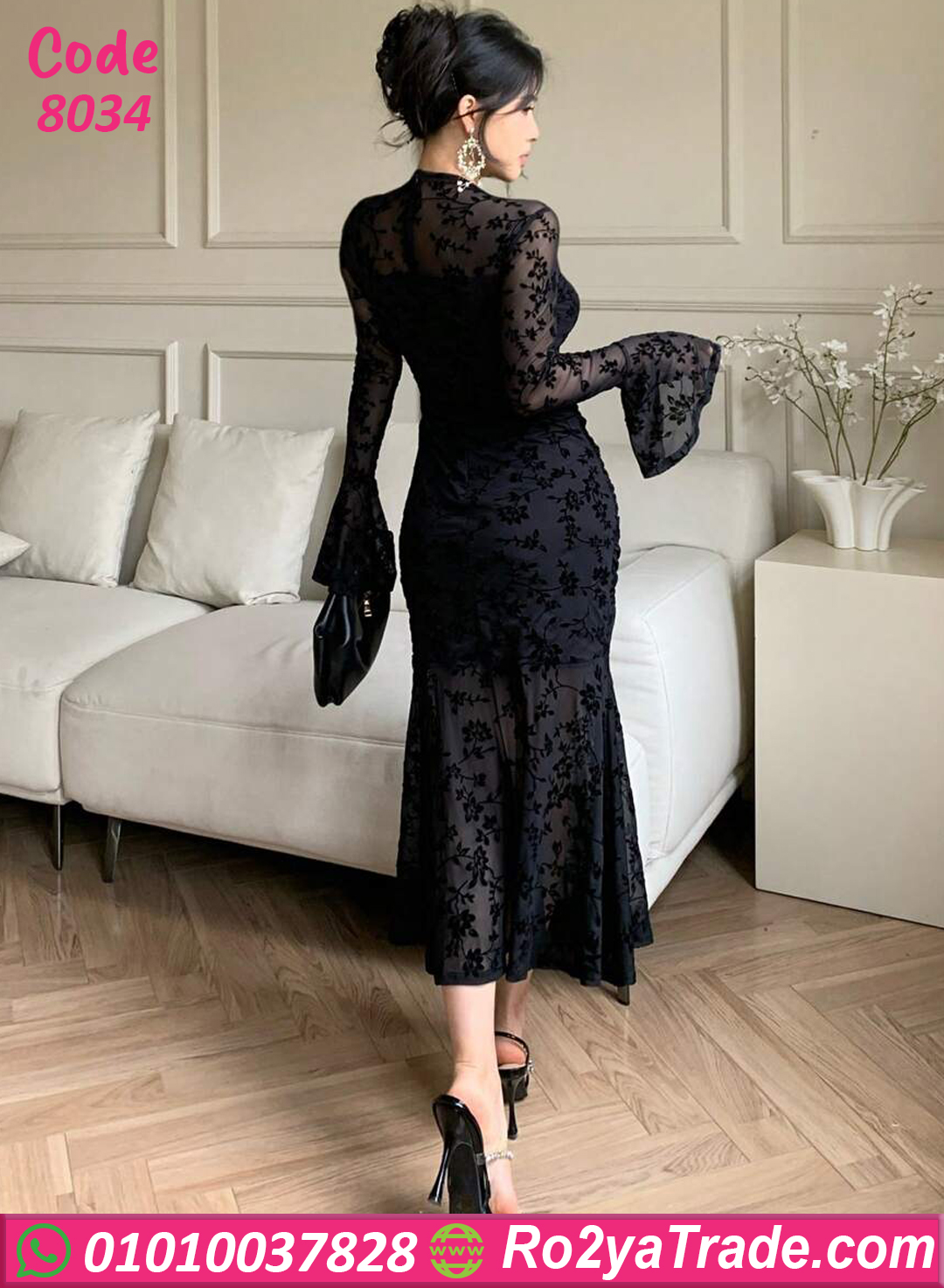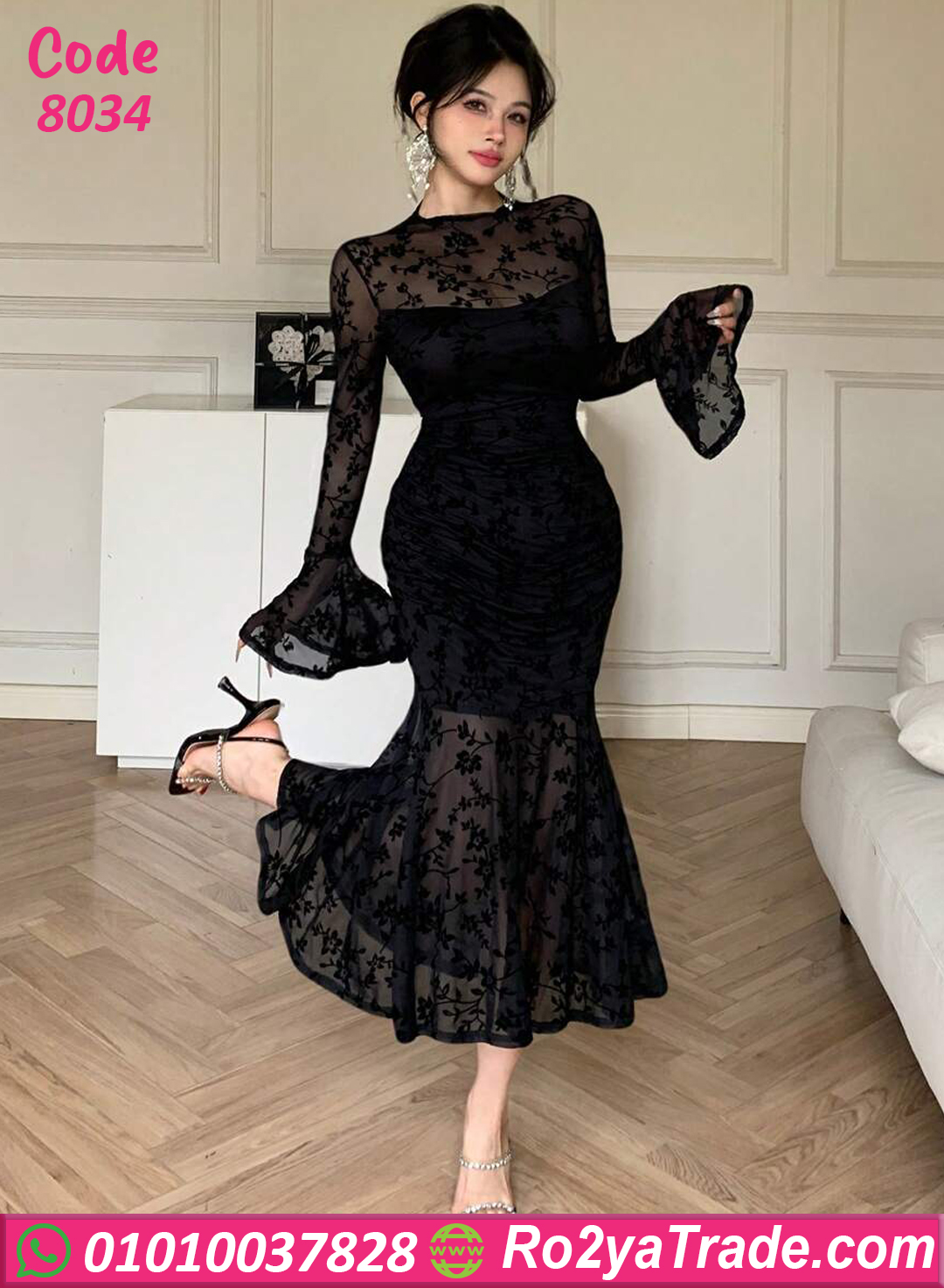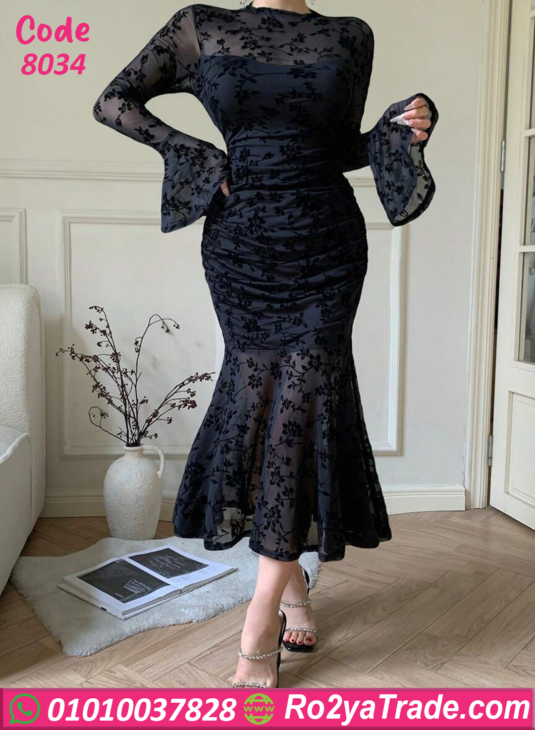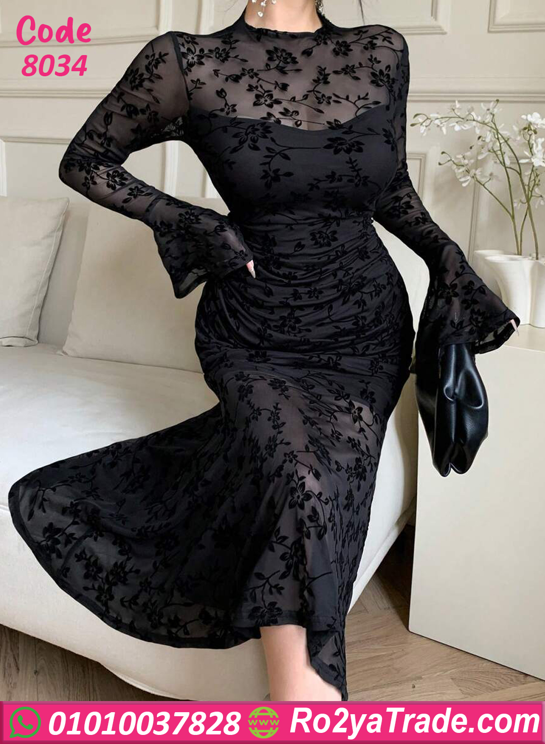 دريس 8034 من أجمل موديلات السوارية اللي بتميزك في أي مناسبة. خامته شيفون ناعم عليه تطريز فلوكي شيك جدًا، مع بطانة مريحة بتدي ثبات وأناقة. الموديل ضيق من الوسط وبينزل منفوش بسيط من تحت، وده بيدي شكل أنثوي راقي ويبرز القوام بشكل جذاب.